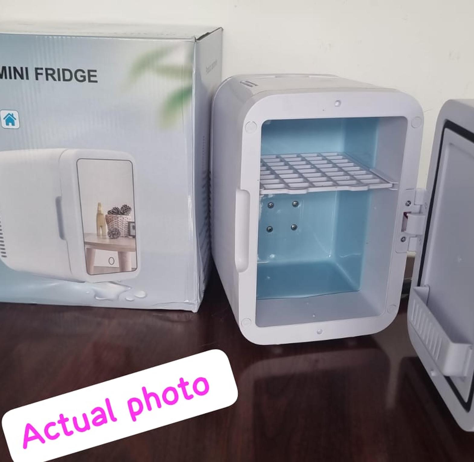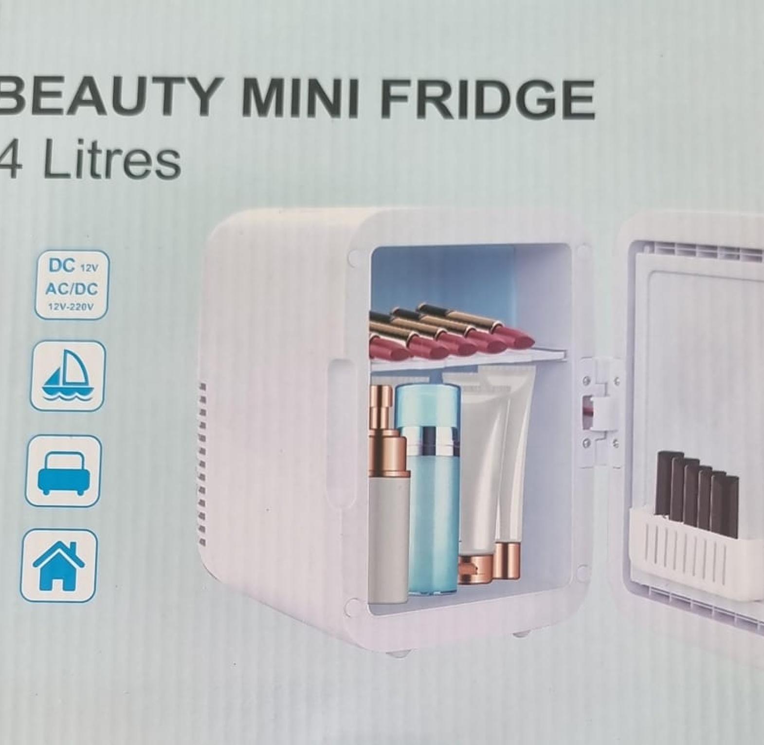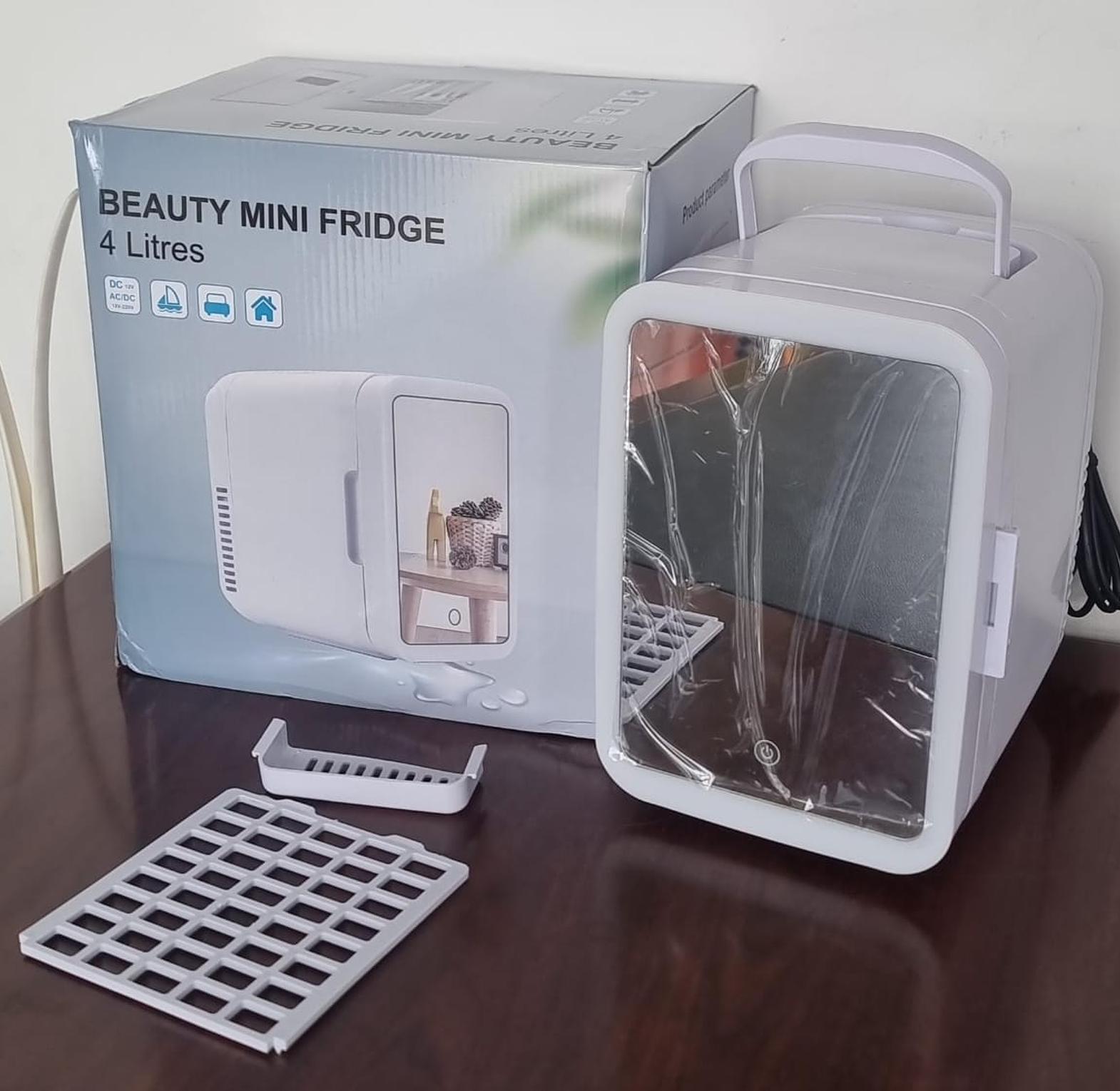 4L portable beauty car fridge with mirror and dual power option for home and car use.