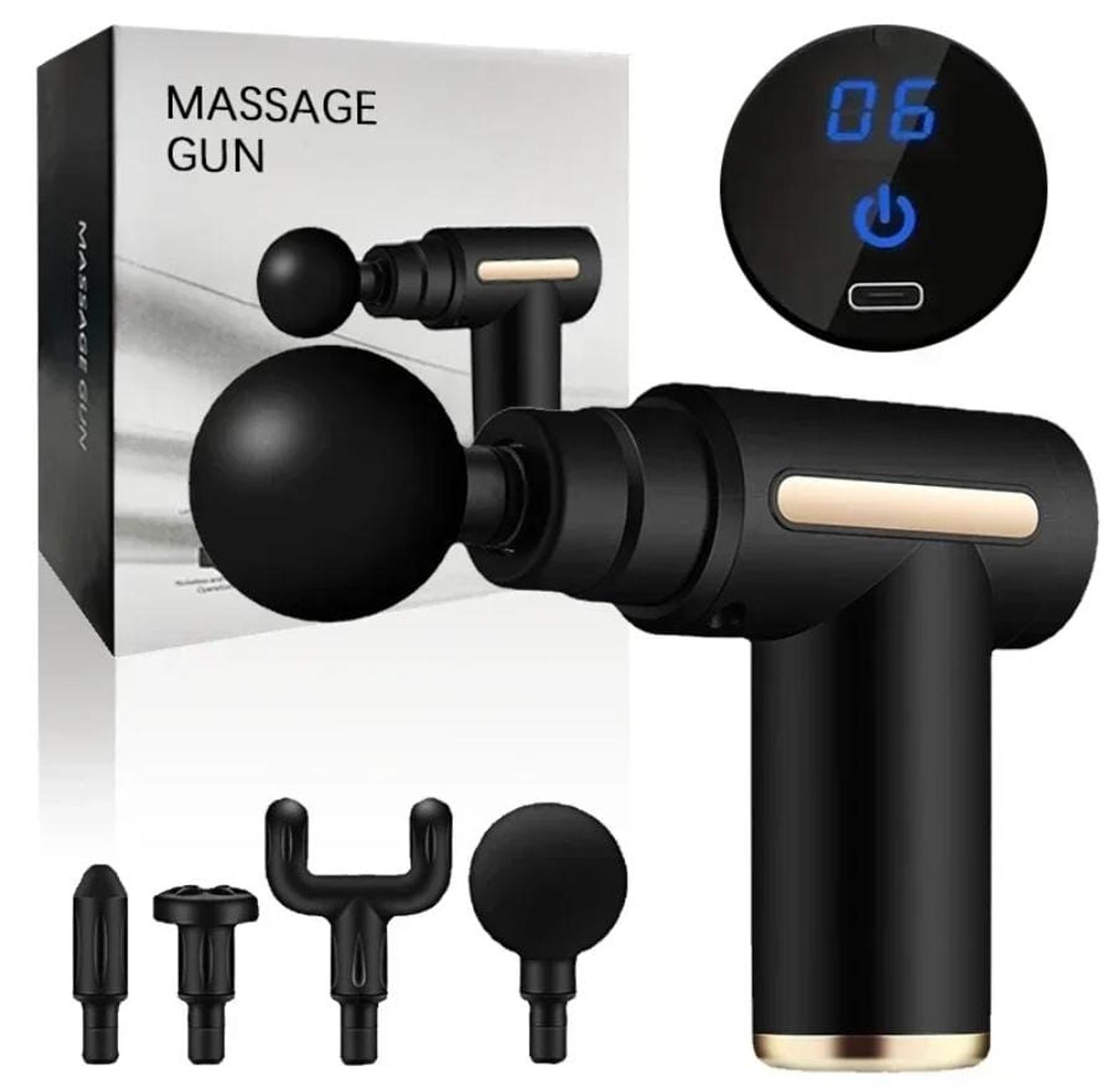 Portable 5-in-1 massage gun for muscle recovery and blood circulation. Ideal for gym and home use