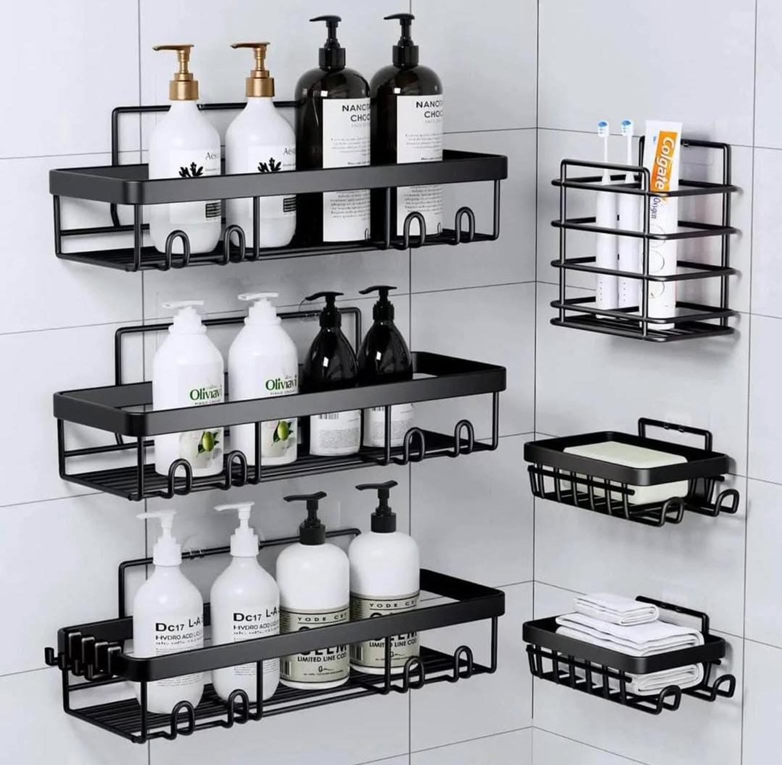 The 6-PC shower caddy set is a spacious and practical bathroom organizer designed to keep toiletries neatly arranged and easily accessible.