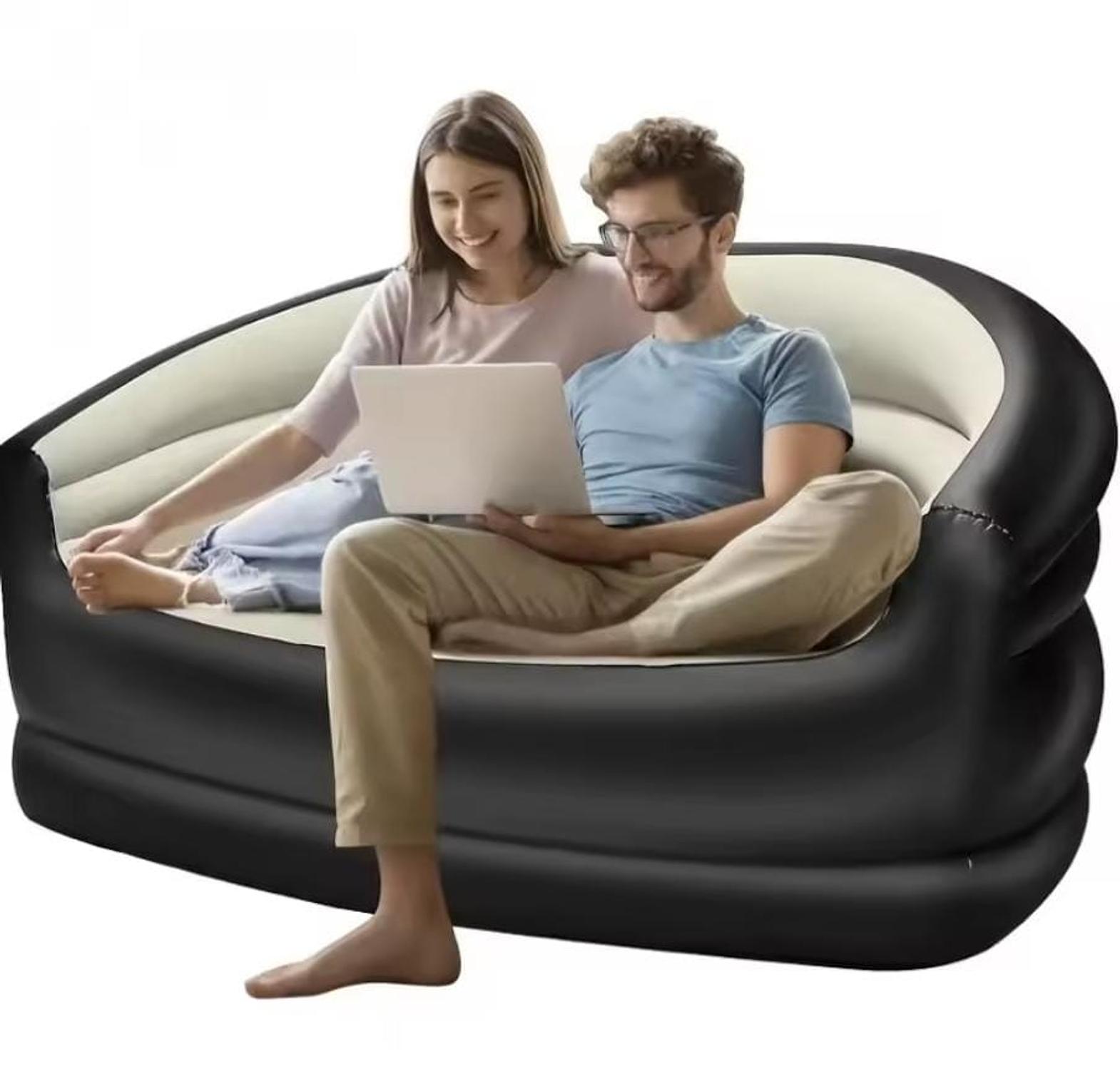 Double size inflatable sofa with dimensions 135×84×62 cm, includes a manual pump.