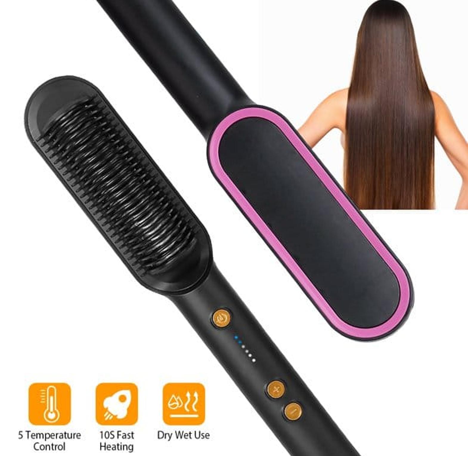 Multi-functional electric hair tool that works as a hair straightener comb, blow dryer, and rotating curling brush with ceramic heating.