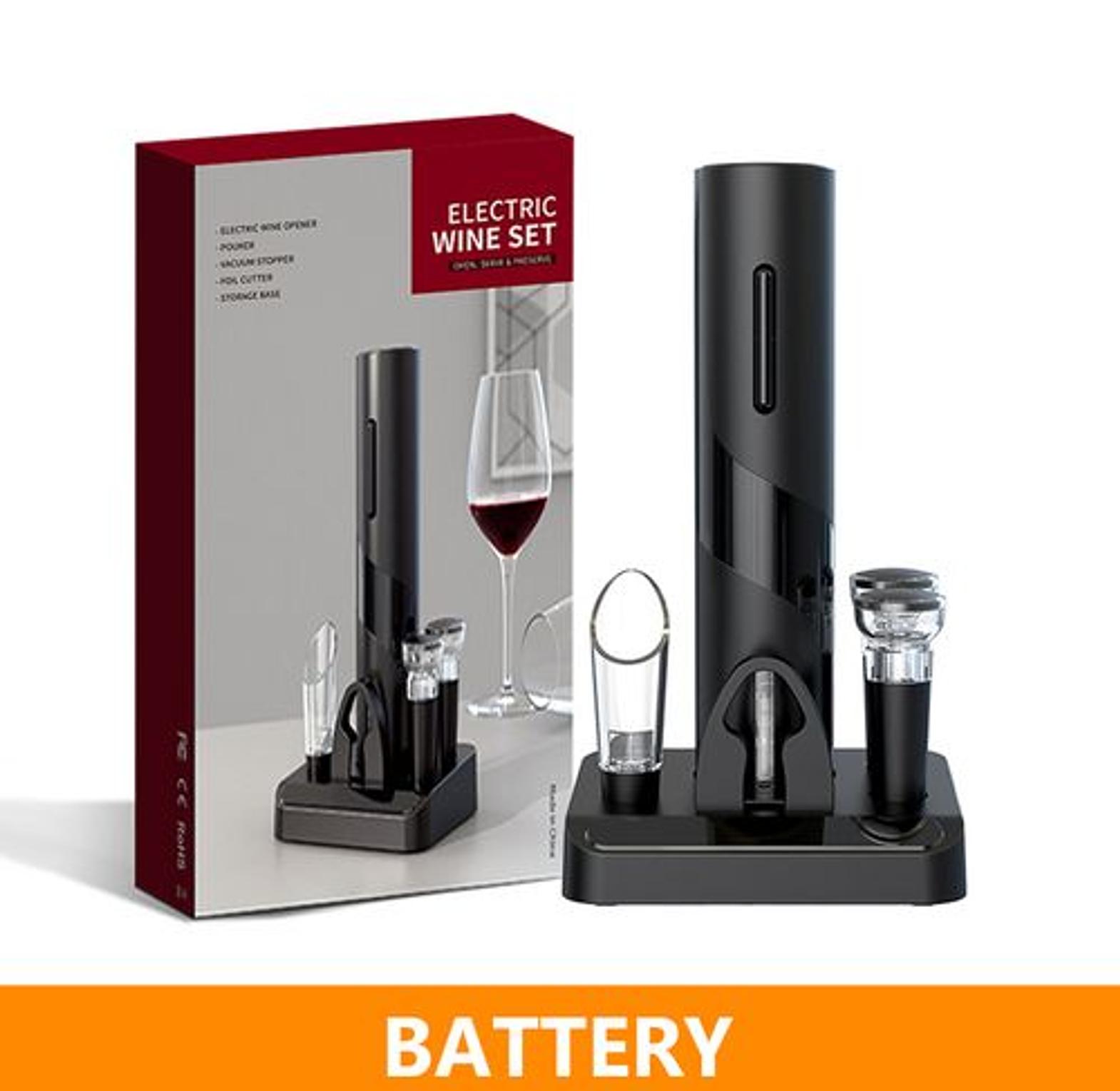 Battery-operated electric wine opener set with complete wine accessories for effortless opening and serving.