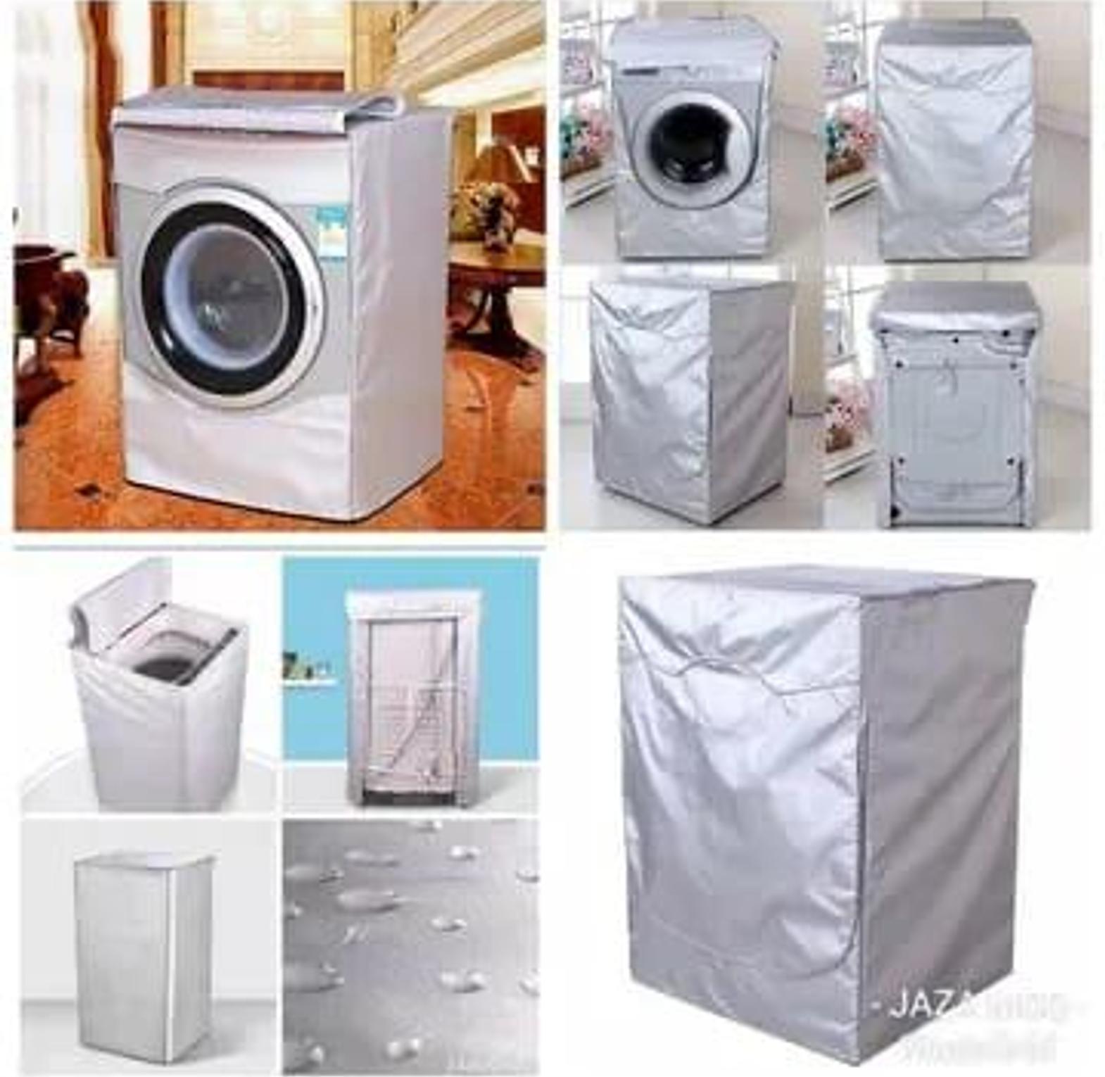 Silver waterproof washing machine cover with zipper design, suitable for front-load machines up to 10kg.