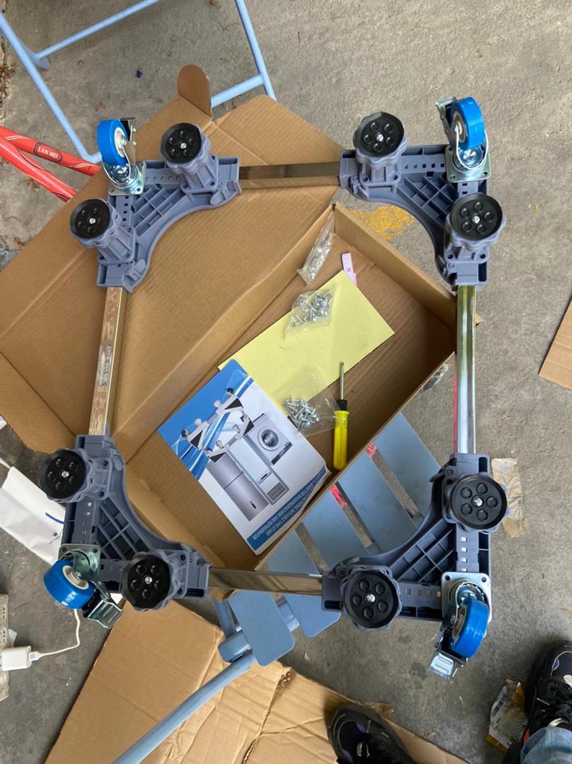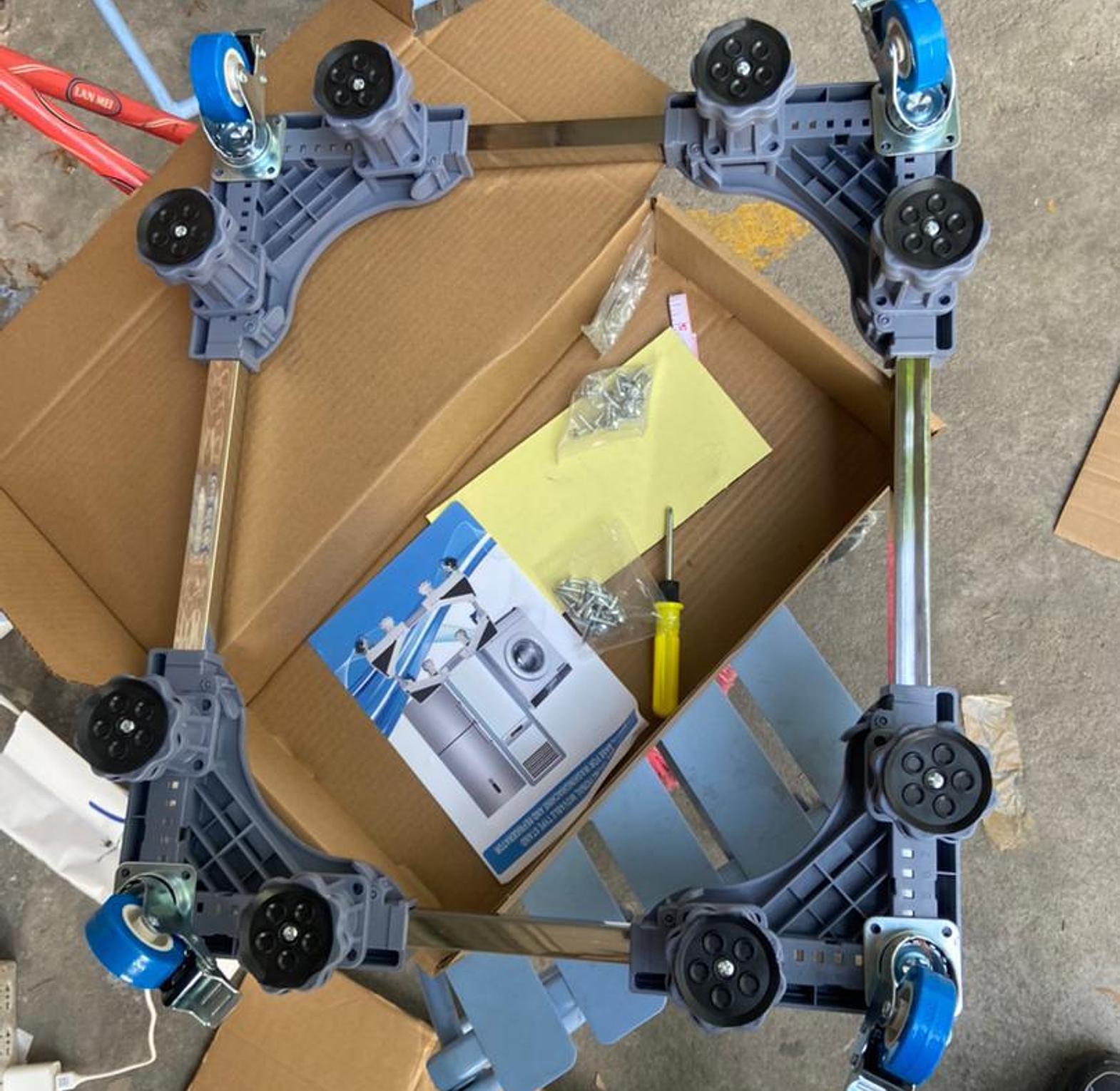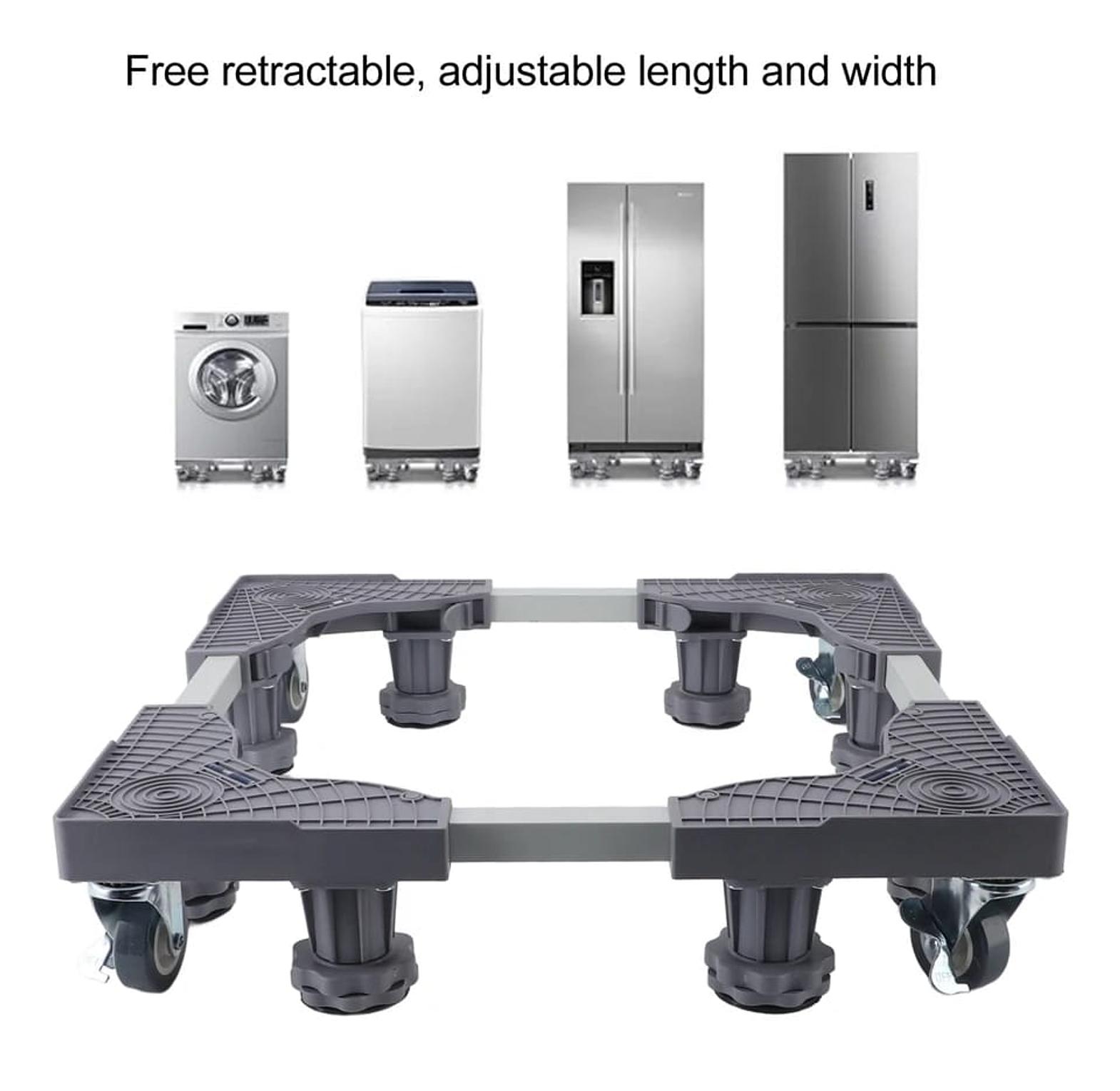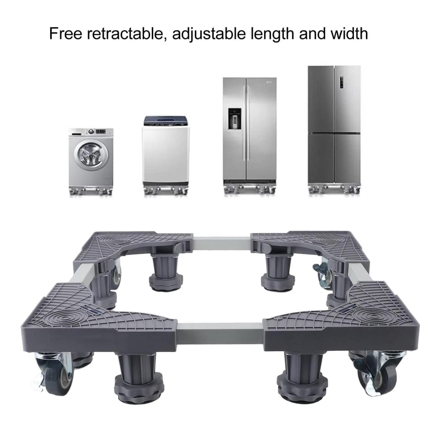 Adjustable heavy-duty appliance roller base designed to lift and support washing machines, dryers, and refrigerators.