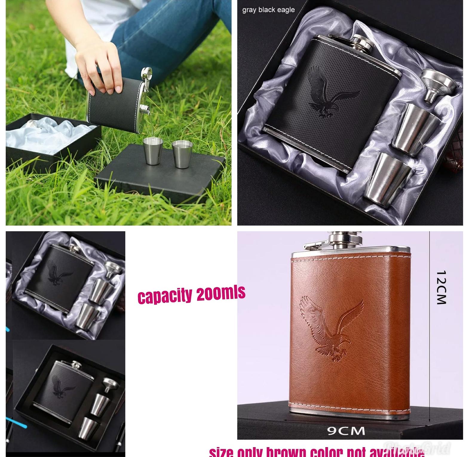 Stylish hip flask whisky bottle set that comes in a premium package with two matching tot cups.