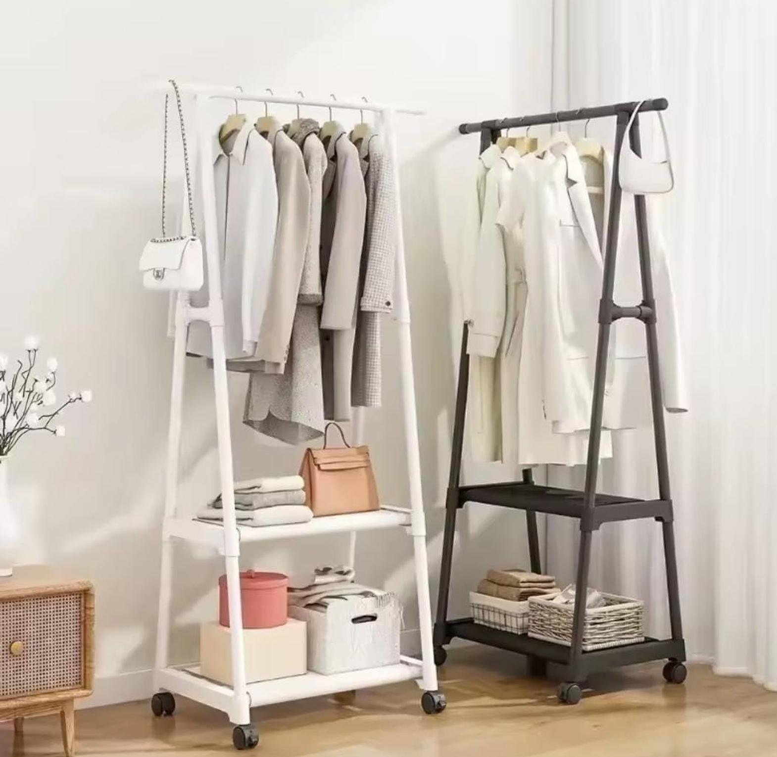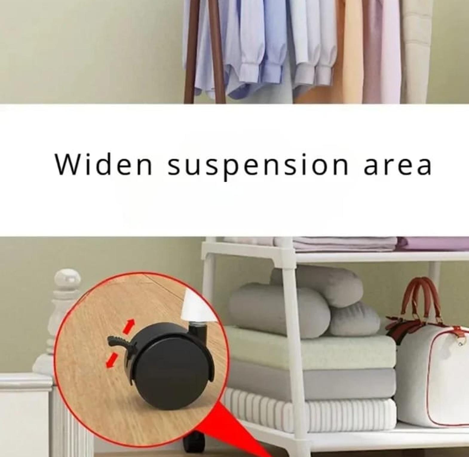 Indoor triangular mobile coat rack with wheels, multi-layer design for hanging and drying clothes.