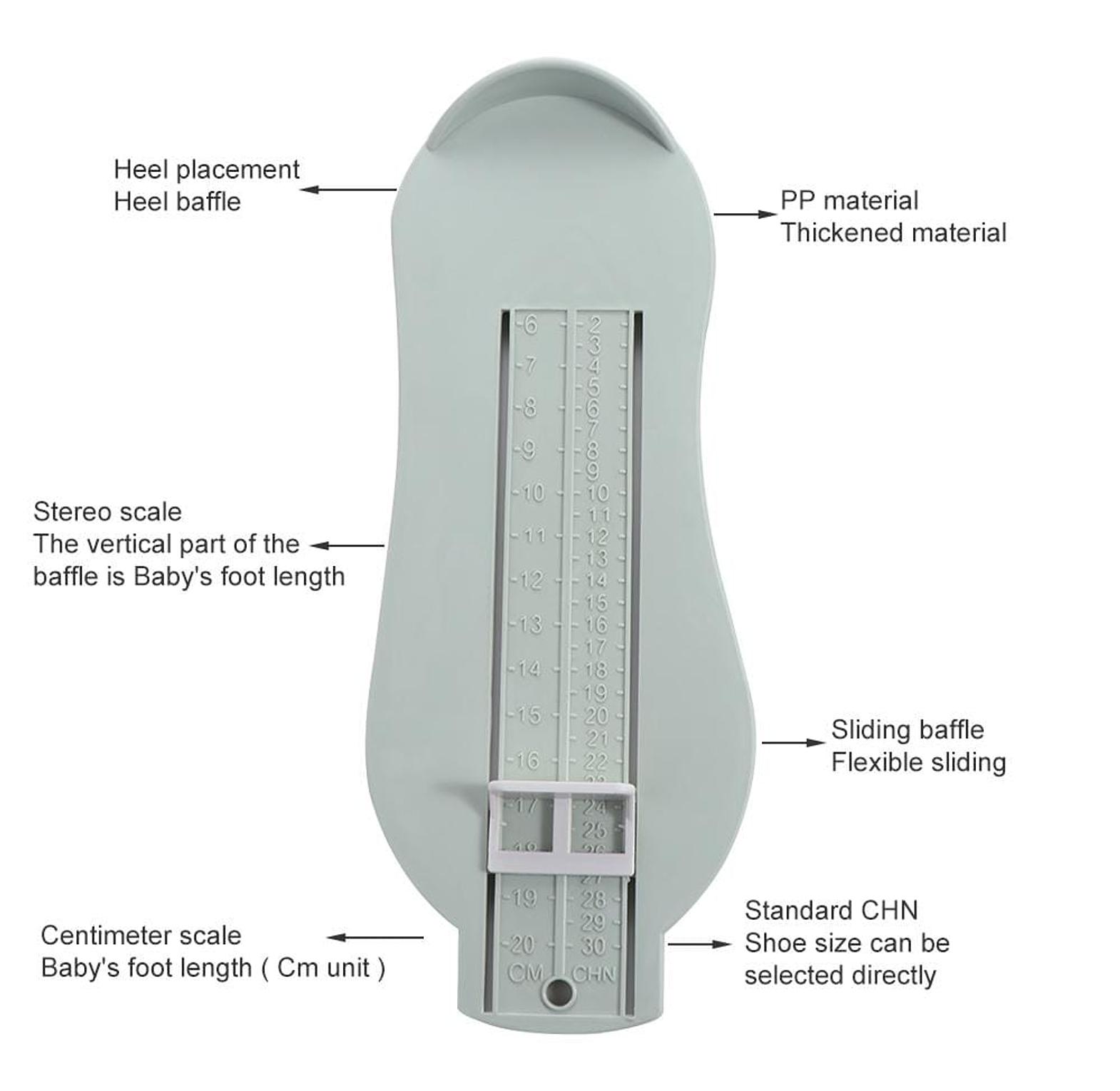 Universal plastic foot measuring gauge for accurately measuring children’s feet to ensure correct shoe sizing and comfort.