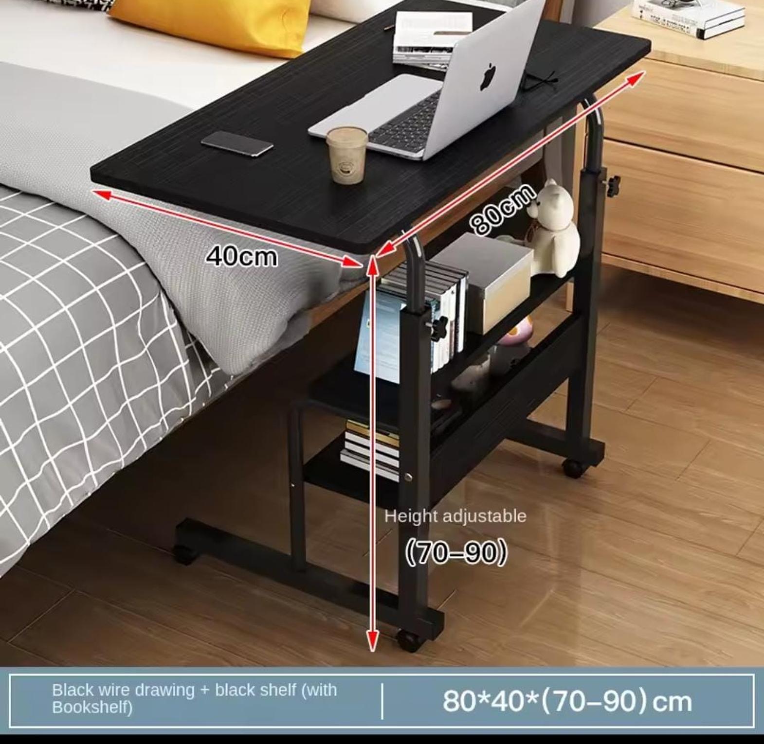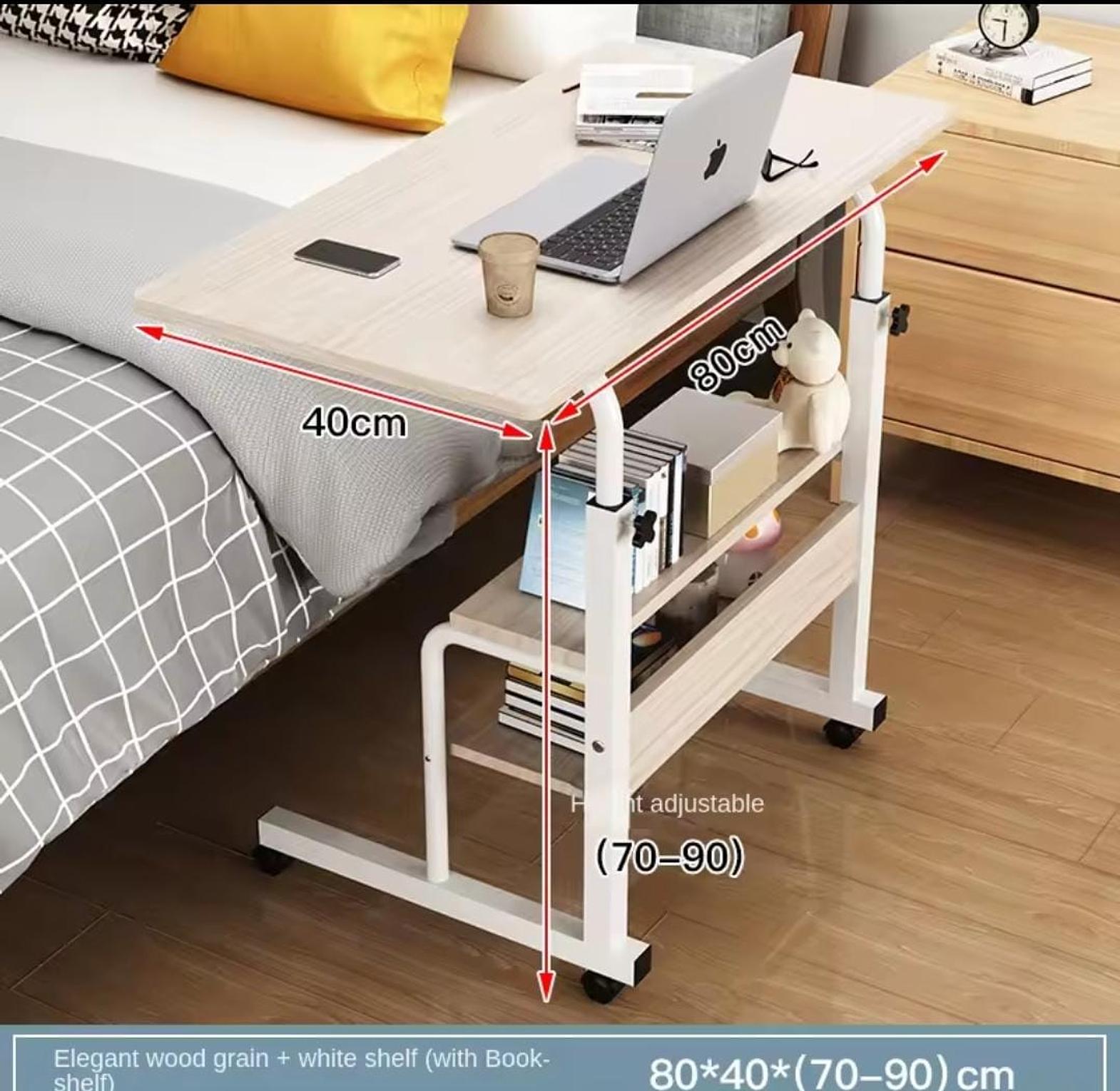 Heavy-duty laptop table with wheels. Adjustable height, strong frame (up to 50KG load) and extra storage shelf.