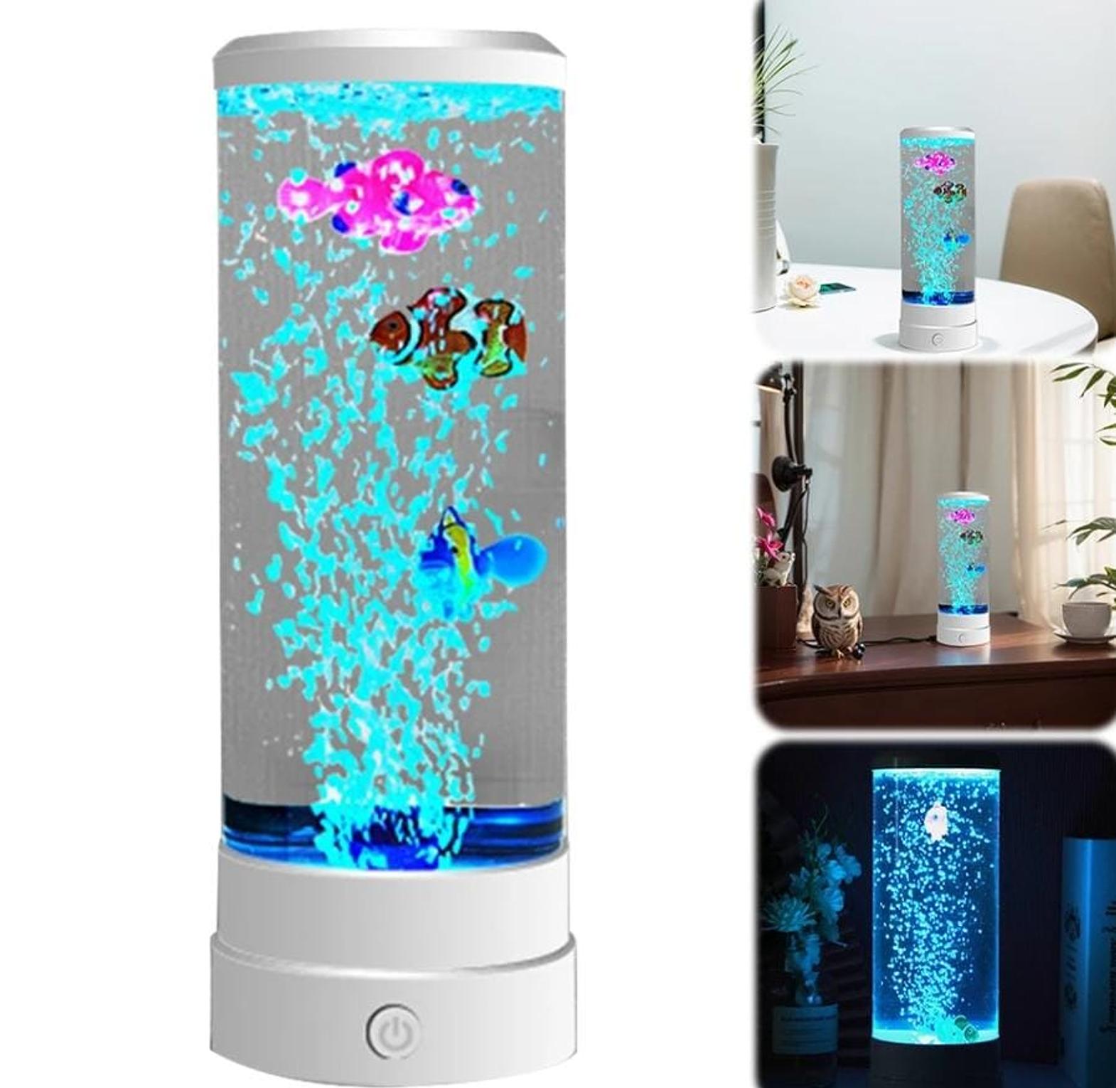 Multi-color LED bubble fish lamp for relaxing home or office decor.