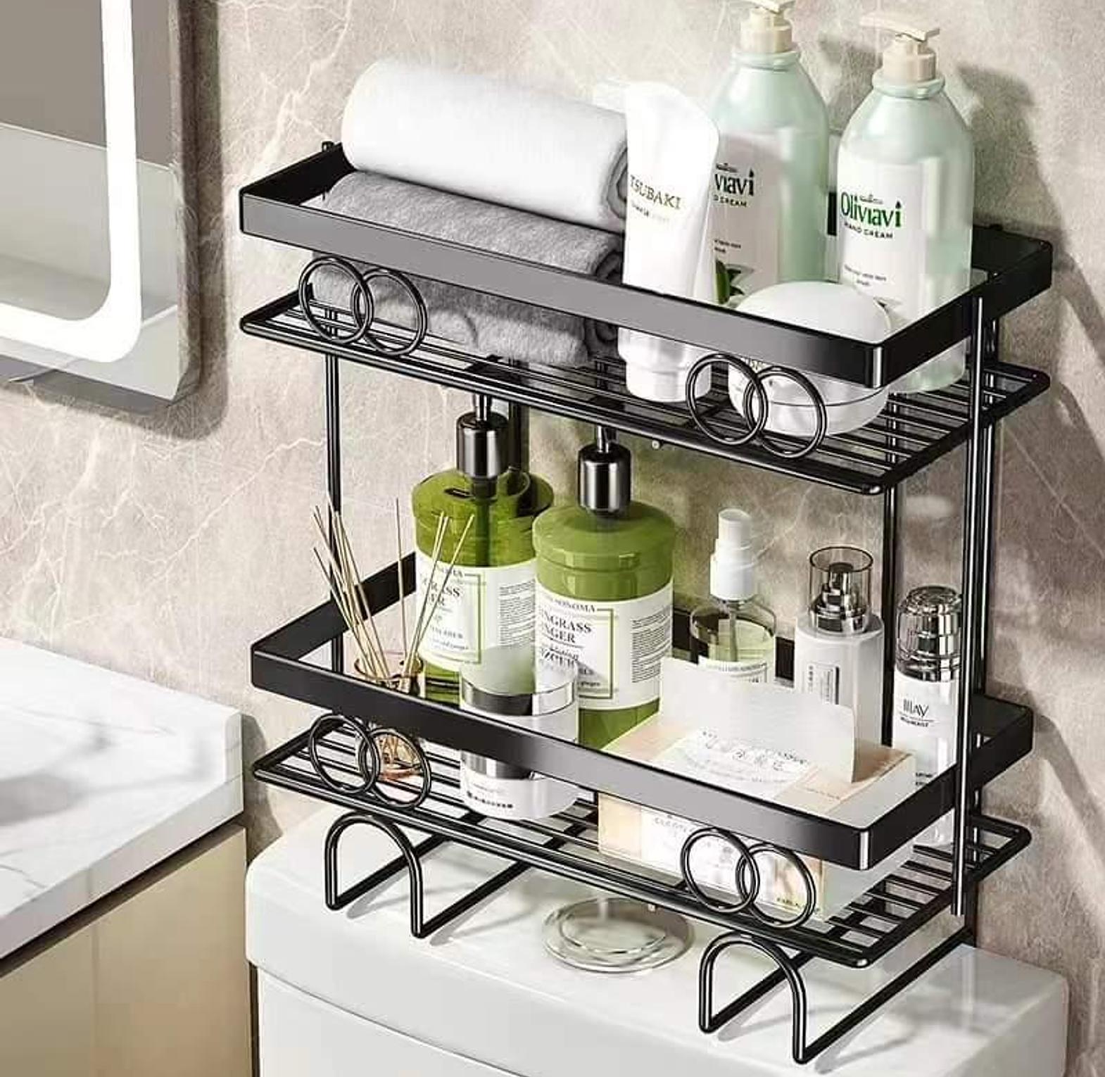 Metal bathroom storage shelf and over-toilet organizer rack for efficient bathroom storage.