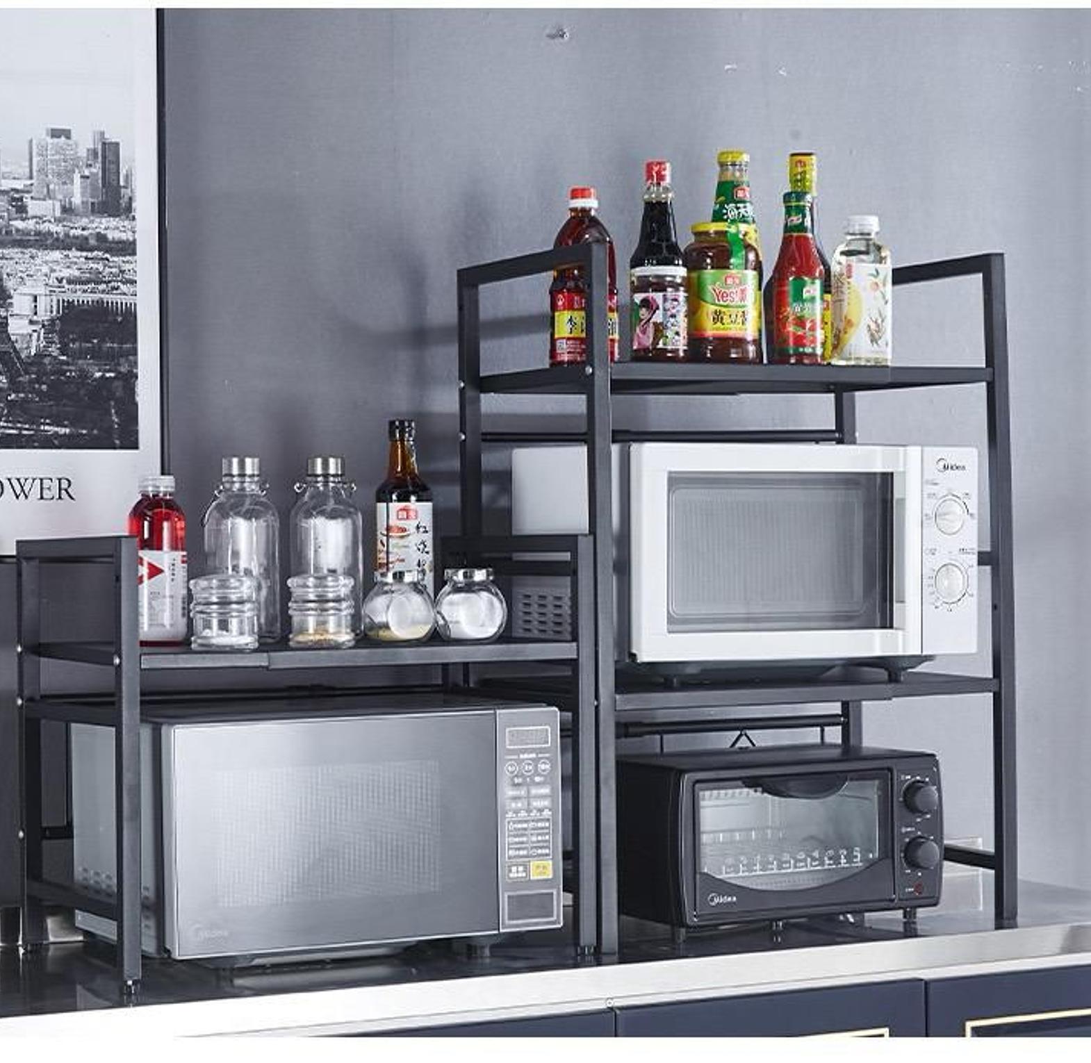 Metal microwave stand for kitchen organization.