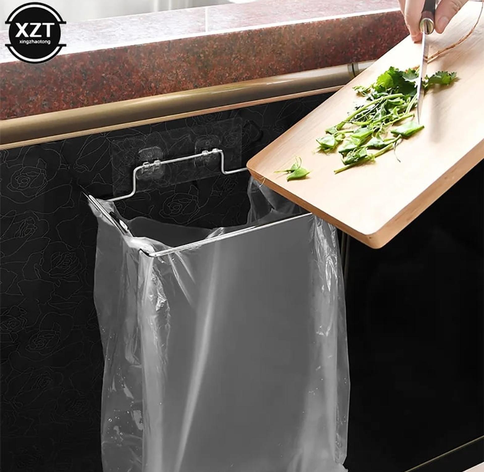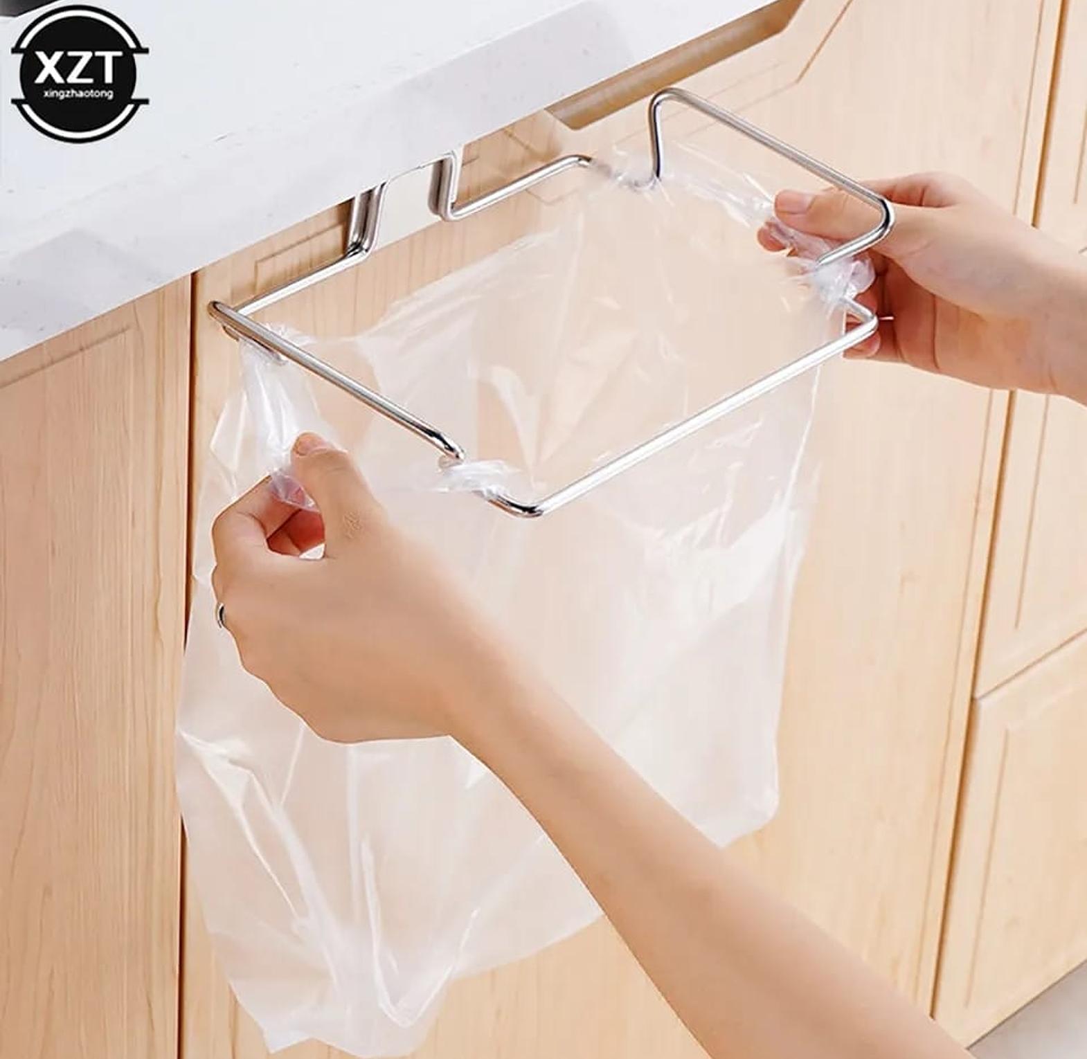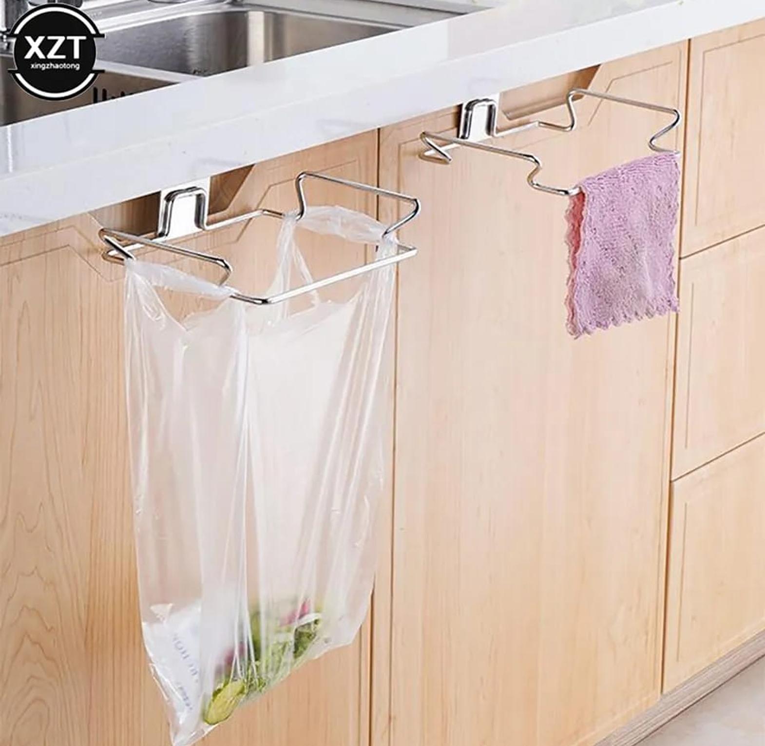 Metallic trash bag holder.