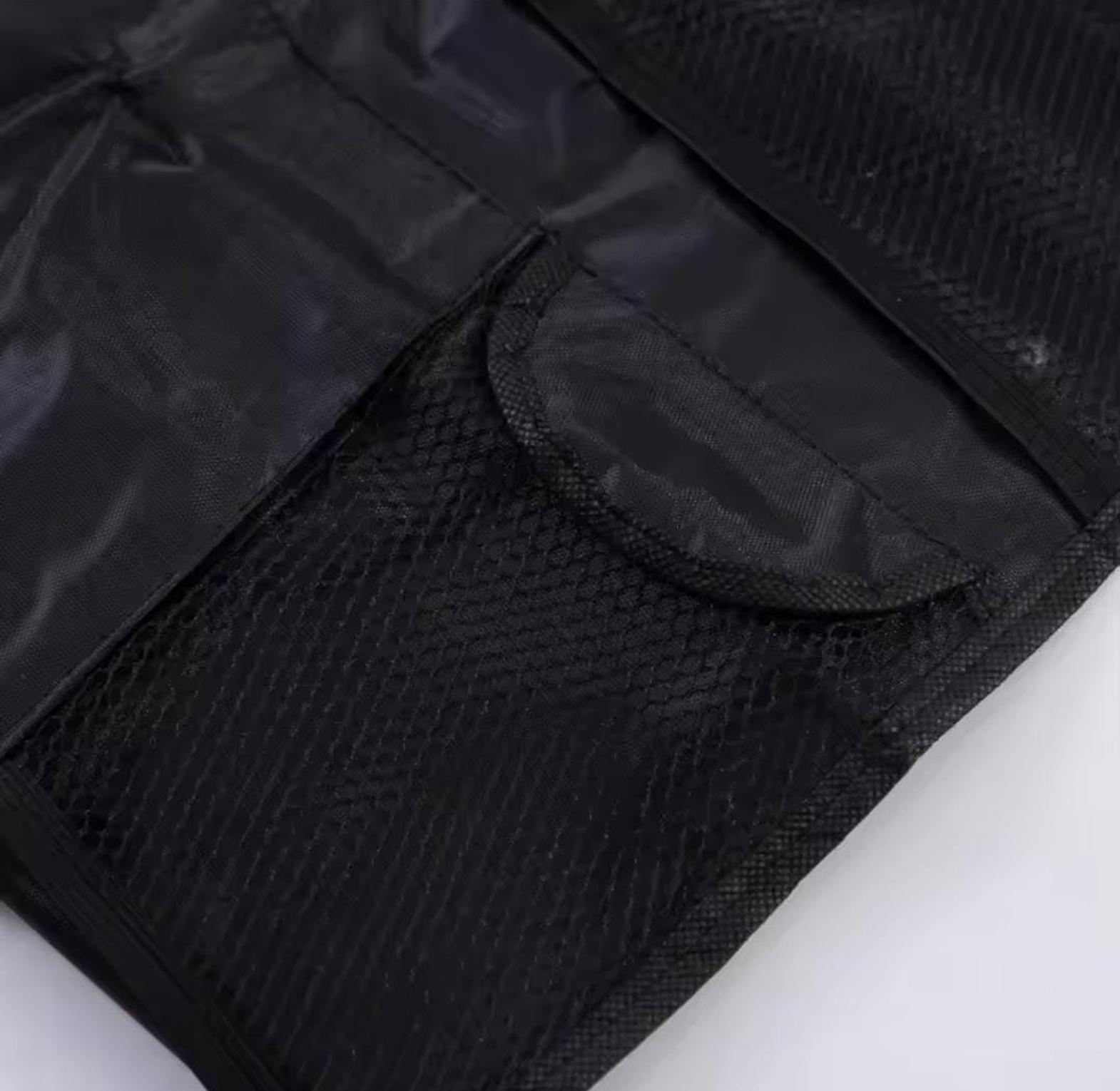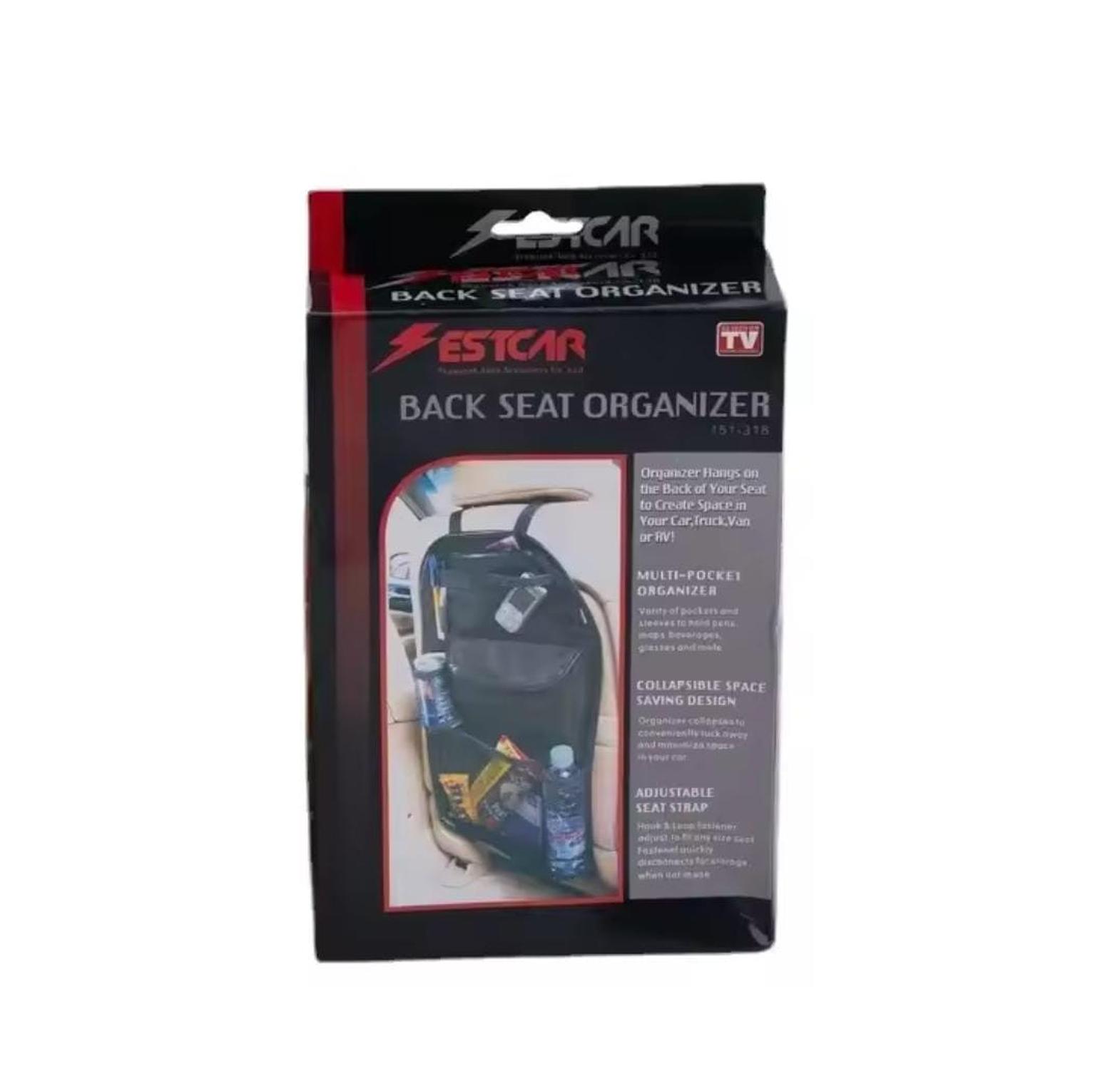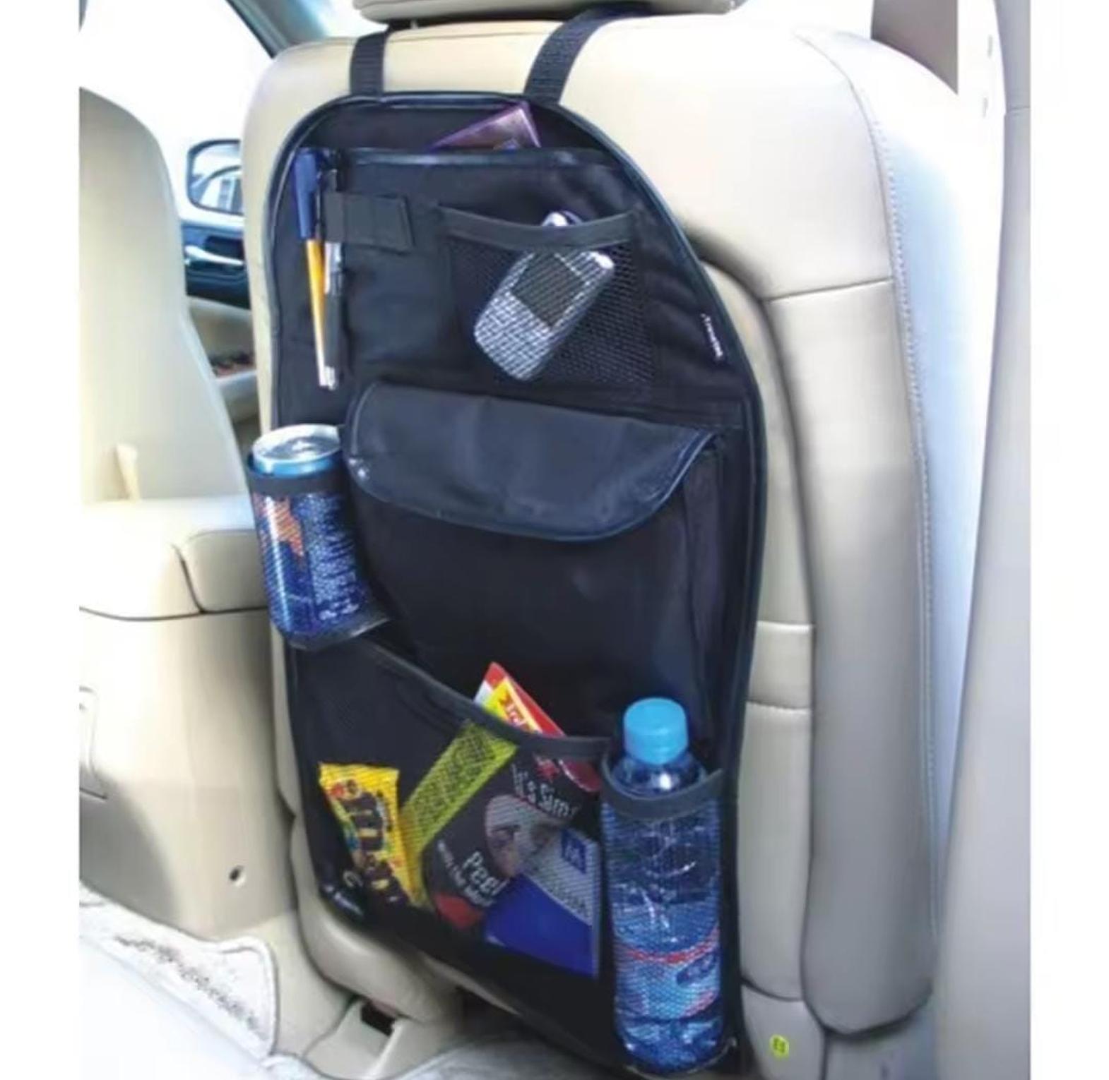 Multifunctional car seat storage bag and back organizer with space for iPad, water bottle, and other essentials.