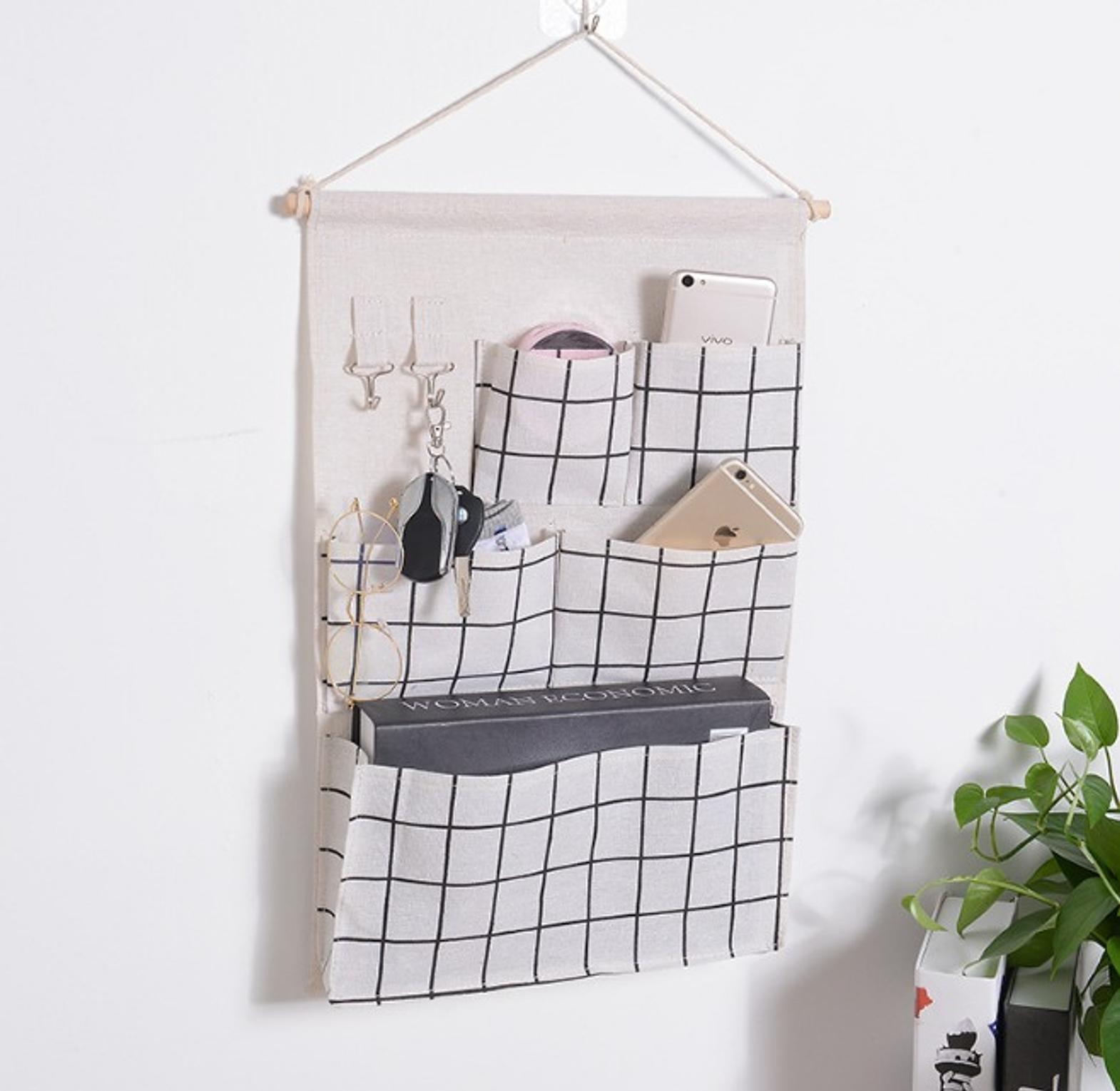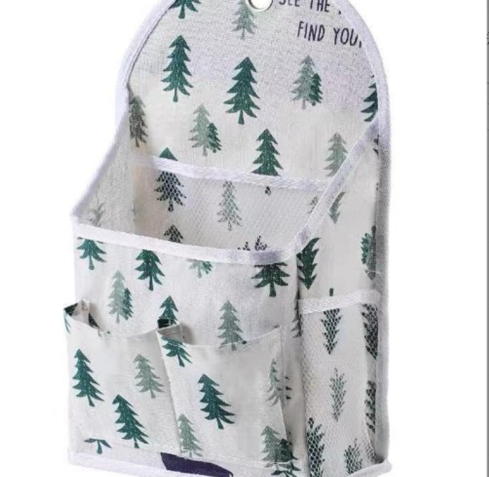 Hanging storage organizer designed to fit over doors for storing magazines, toiletries, accessories, or bathroom items.