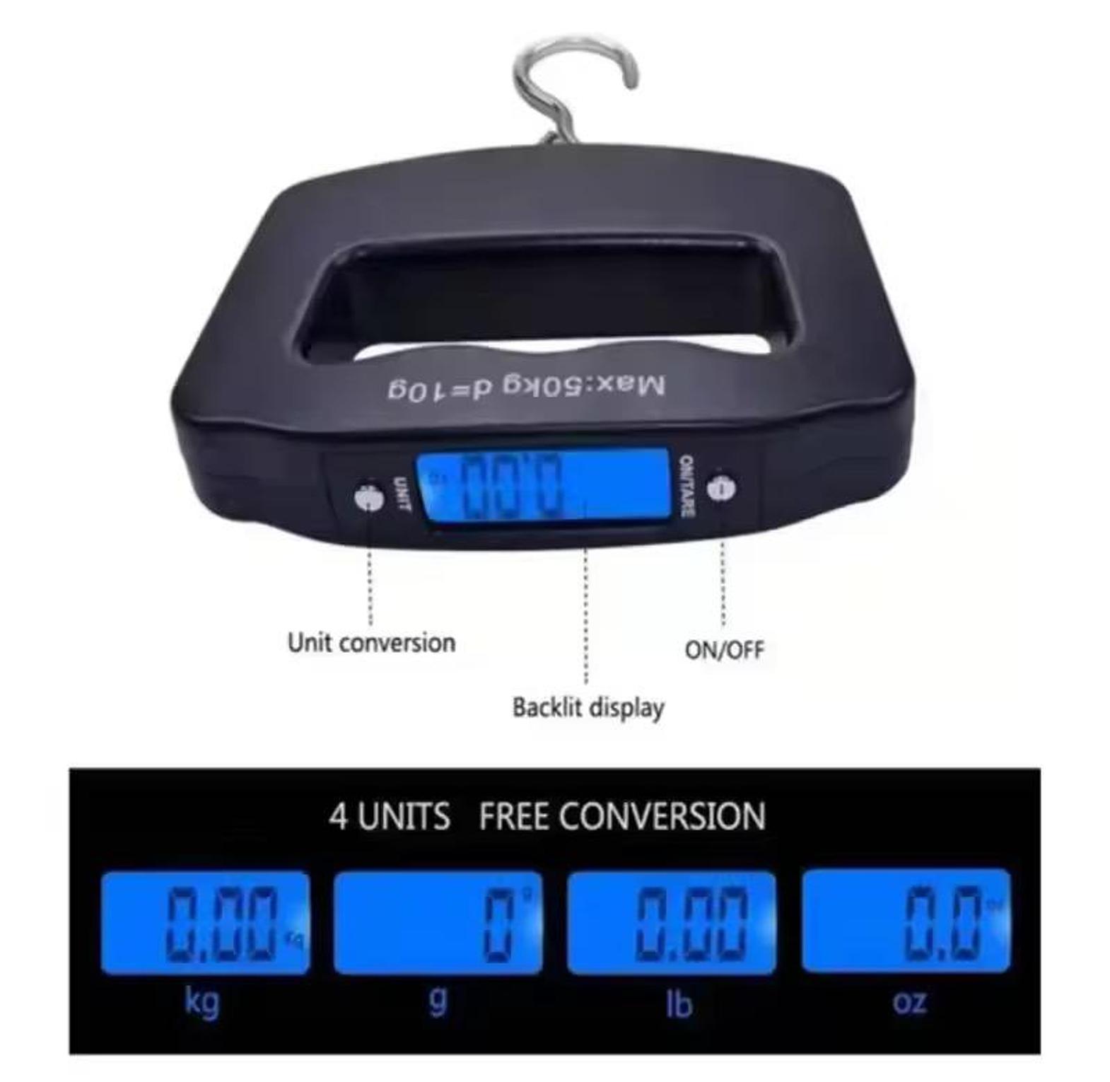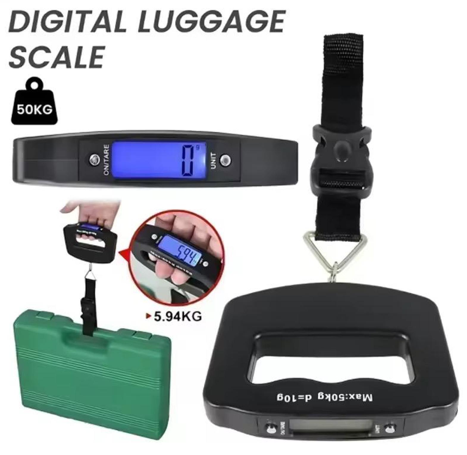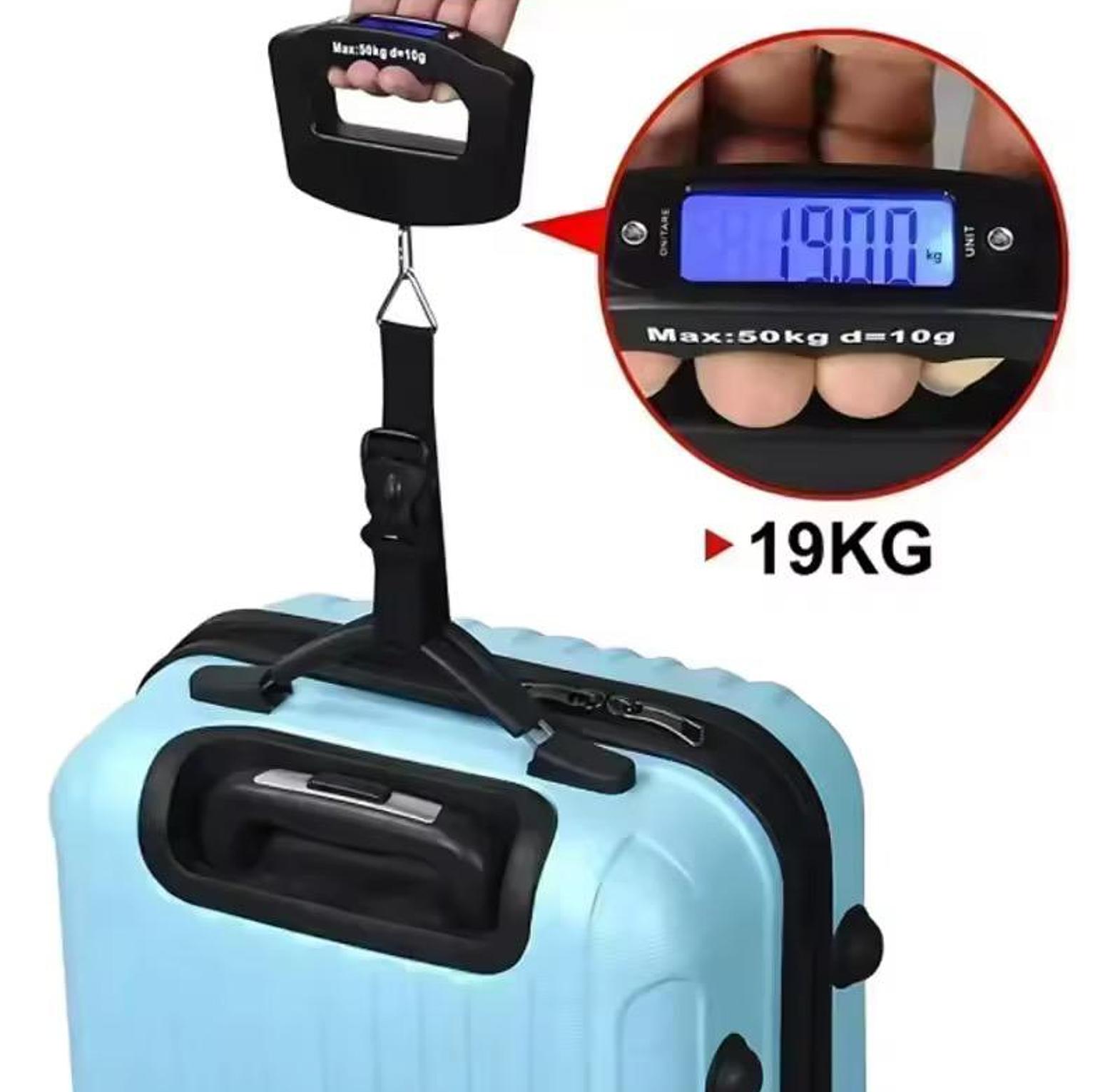 Portable electronic hanging luggage scale with digital display and backlight for accurate travel weighing.