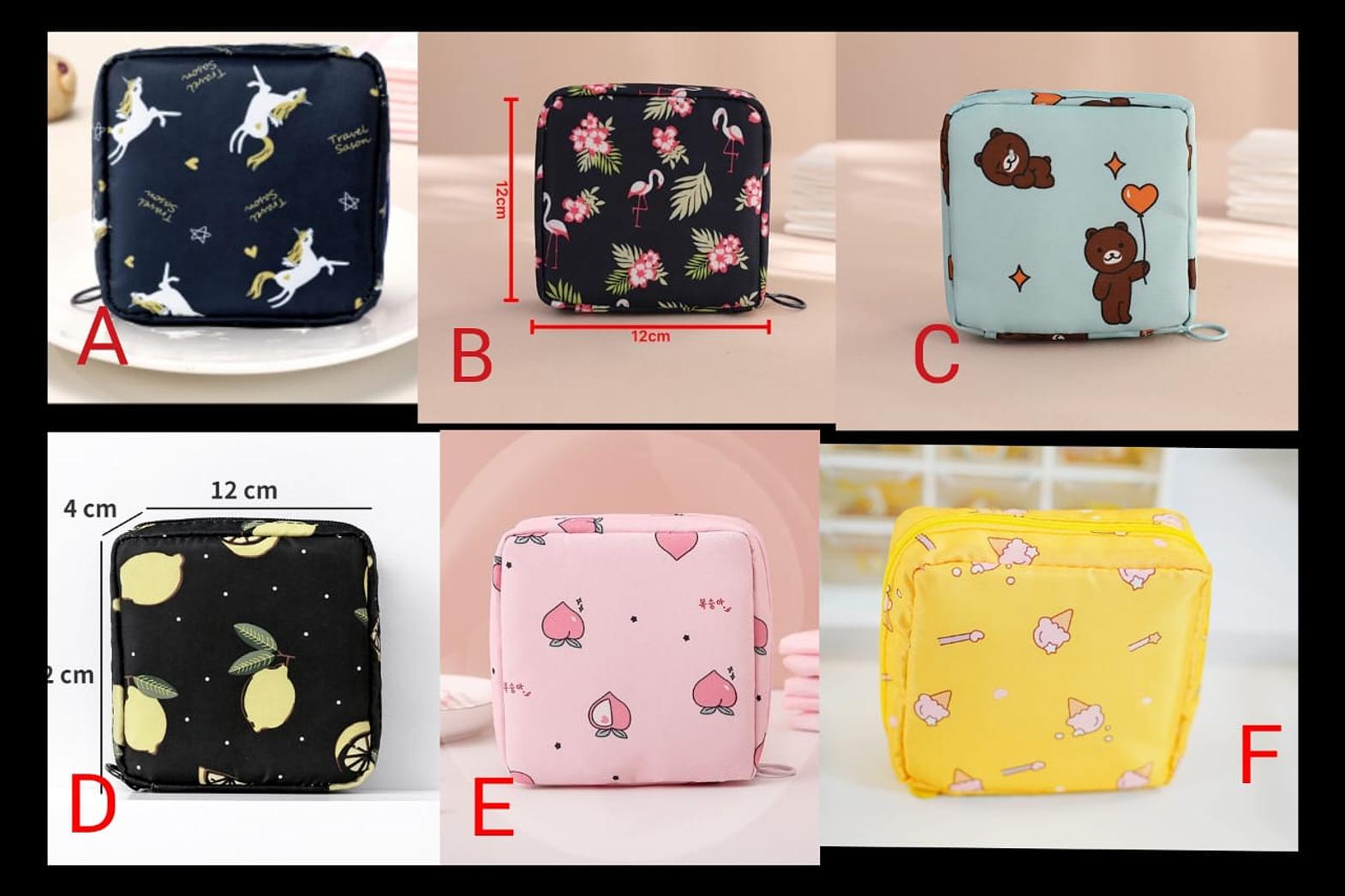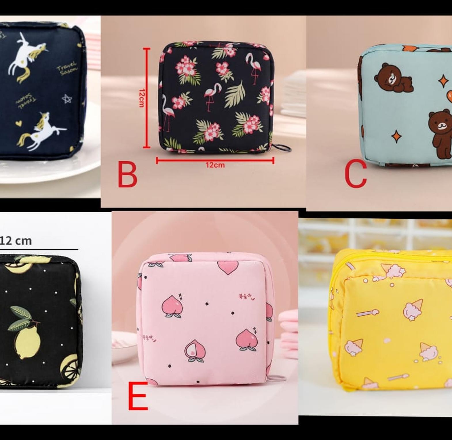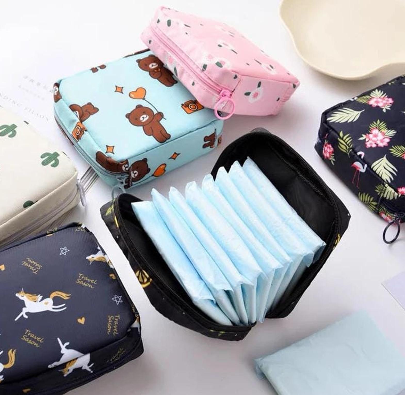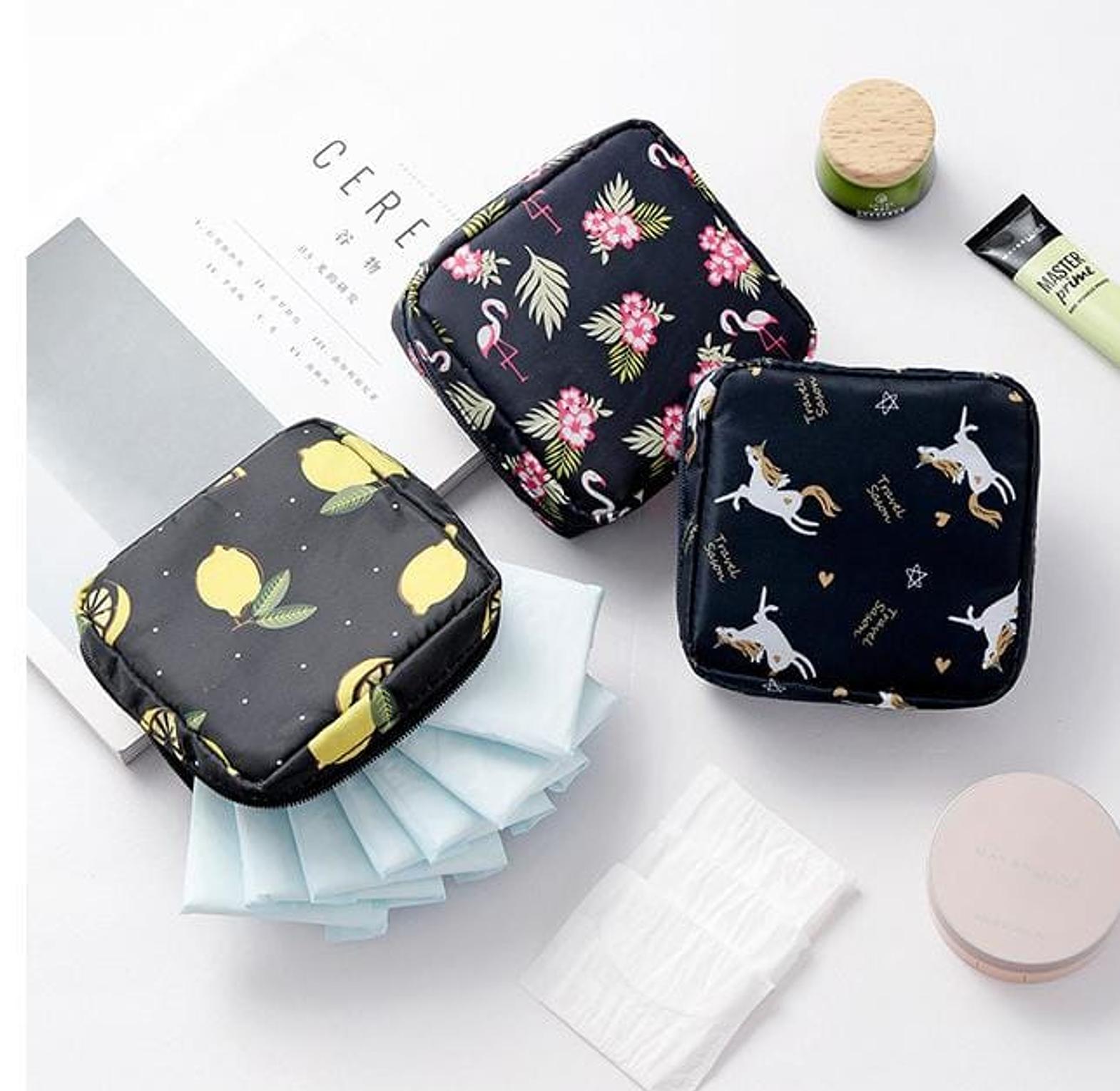 Compact and stylish storage bag for sanitary pads, tampons, or cosmetics.