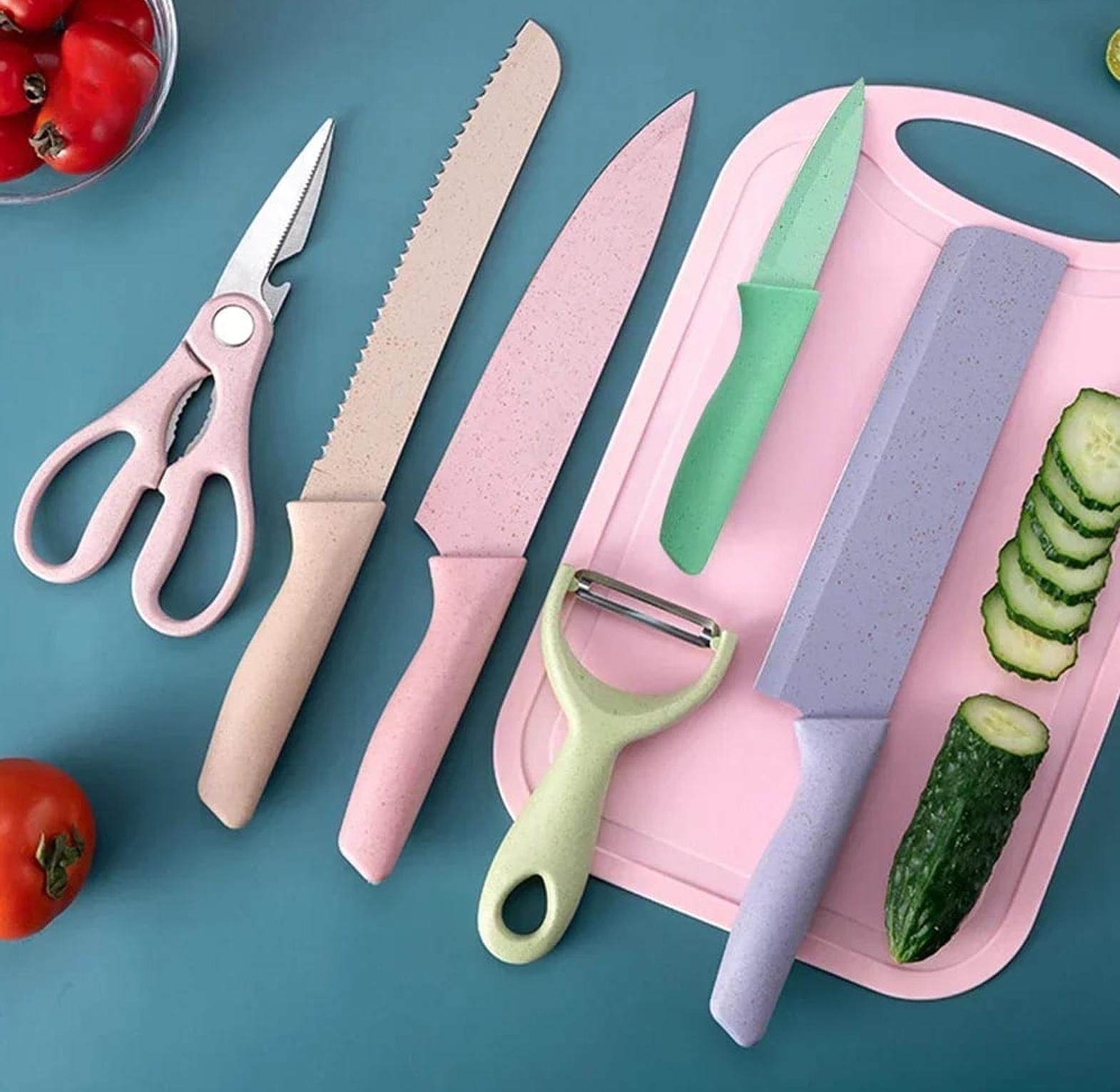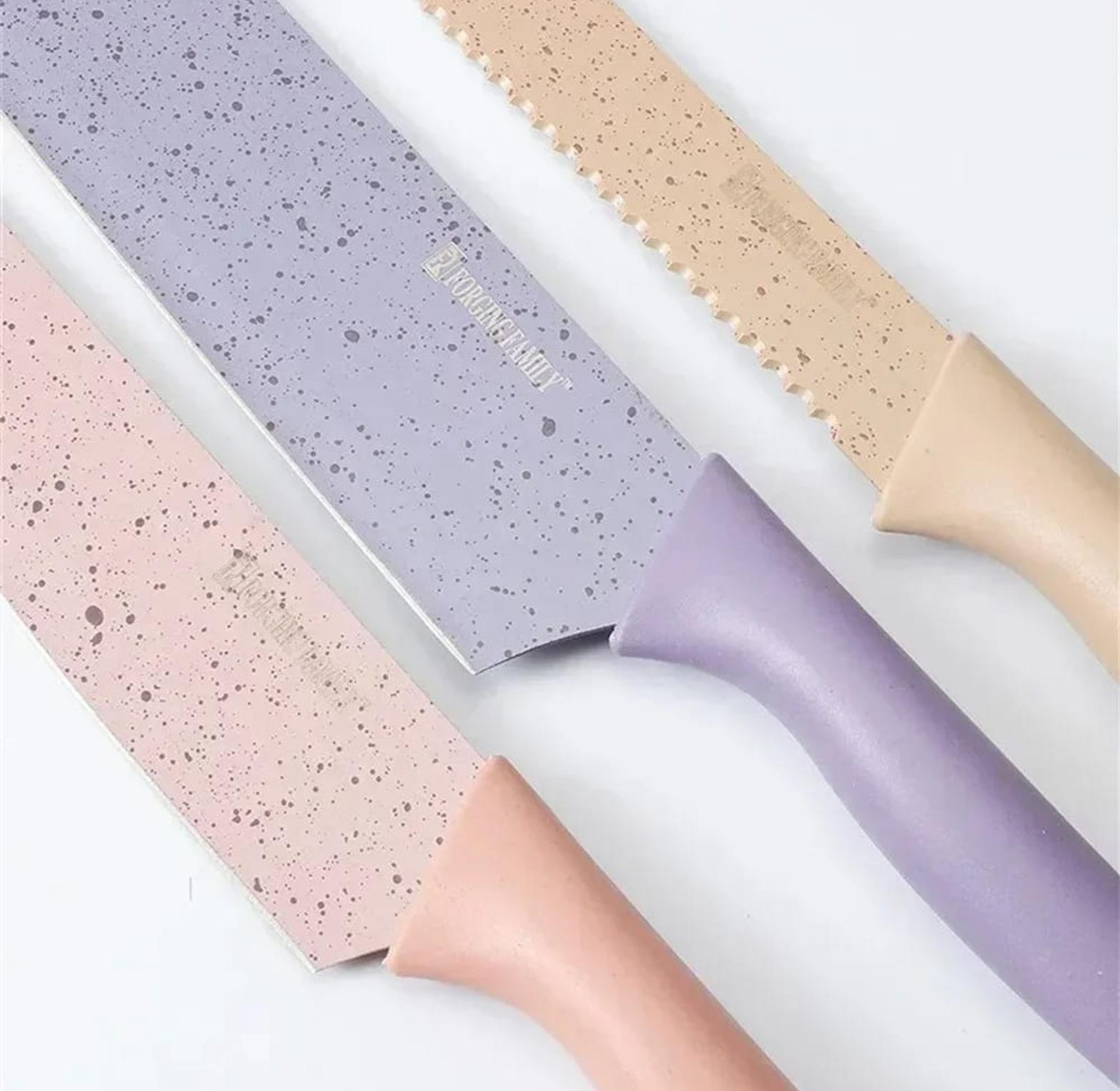 Six-piece macaroon-colored stainless steel knife set with gift box for home kitchen use.