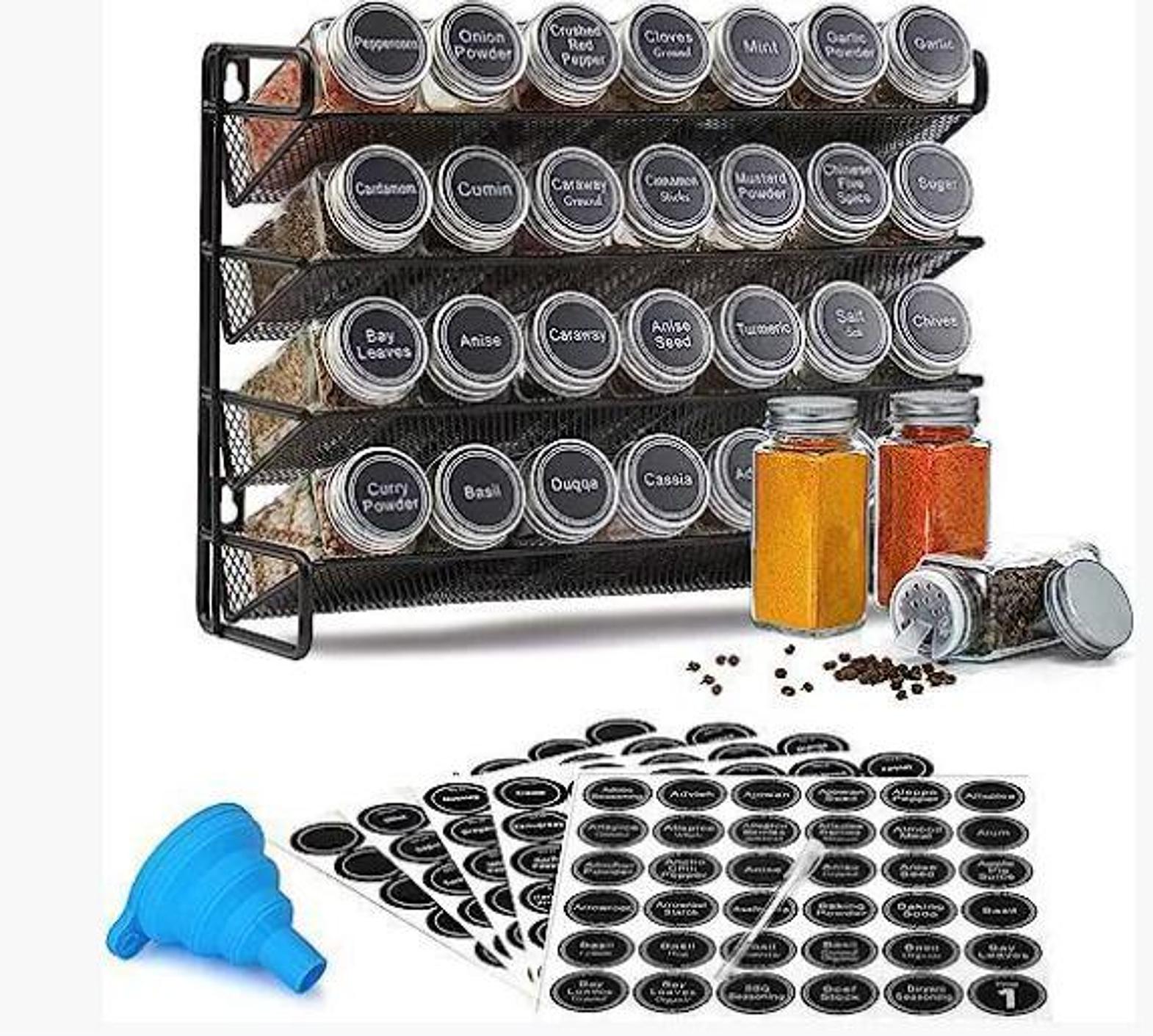 4-layer powder-coated carbon steel spice rack with 28 labeled bottles and white pen—durable, compact, and perfect for organized kitchens.