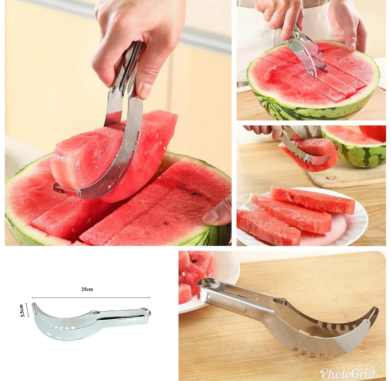Durable stainless steel melon cutter for quick, clean slicing of watermelon and other fruits.