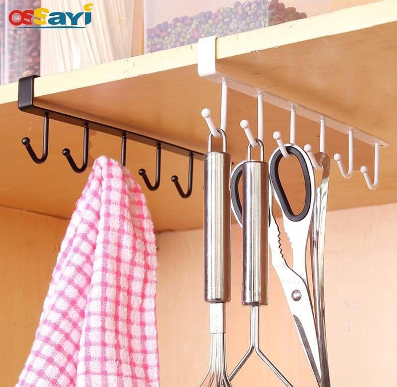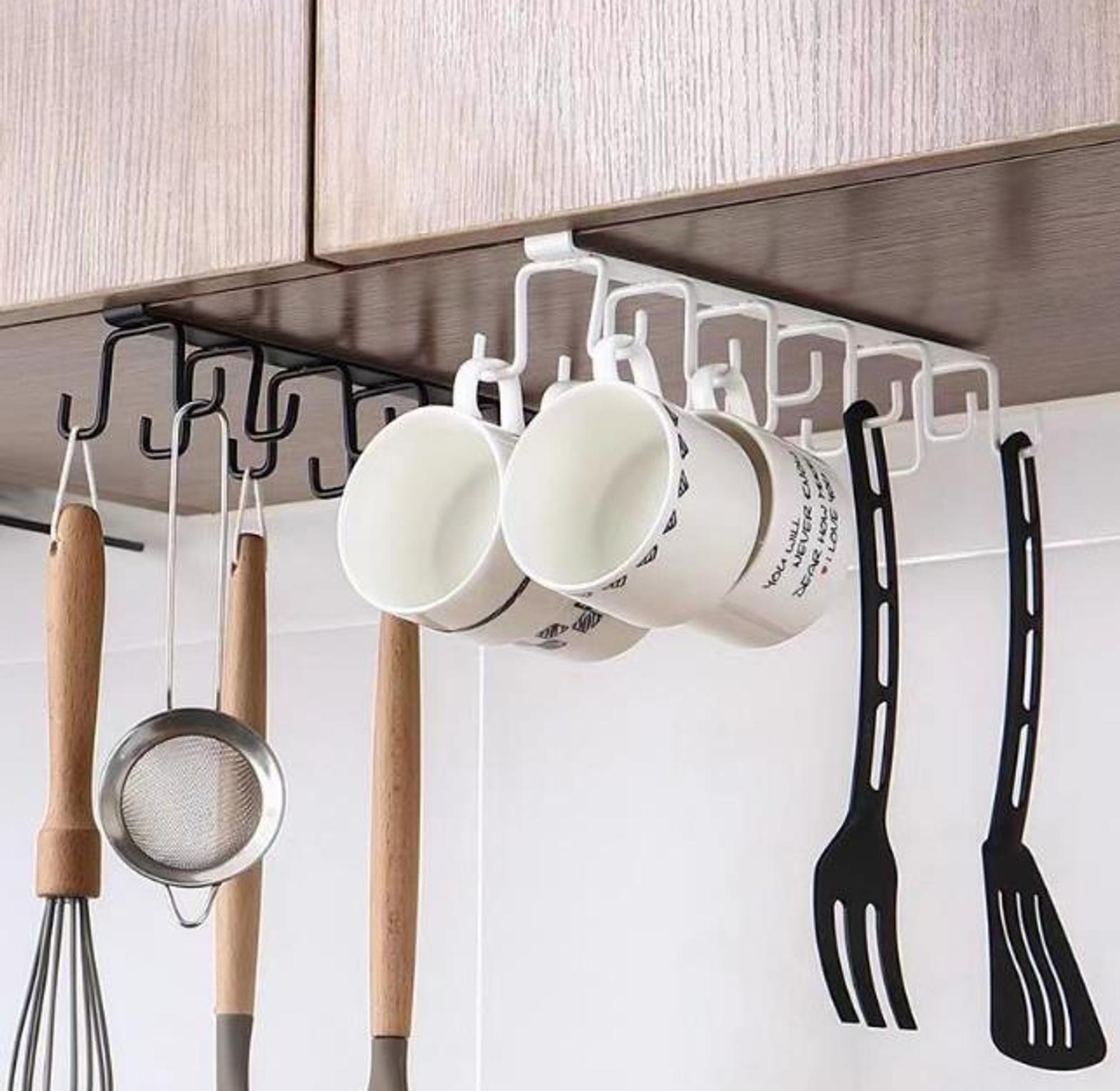 6-slot metallic under-shelf hooks designed for organizing kitchenware, accessories, or household items.