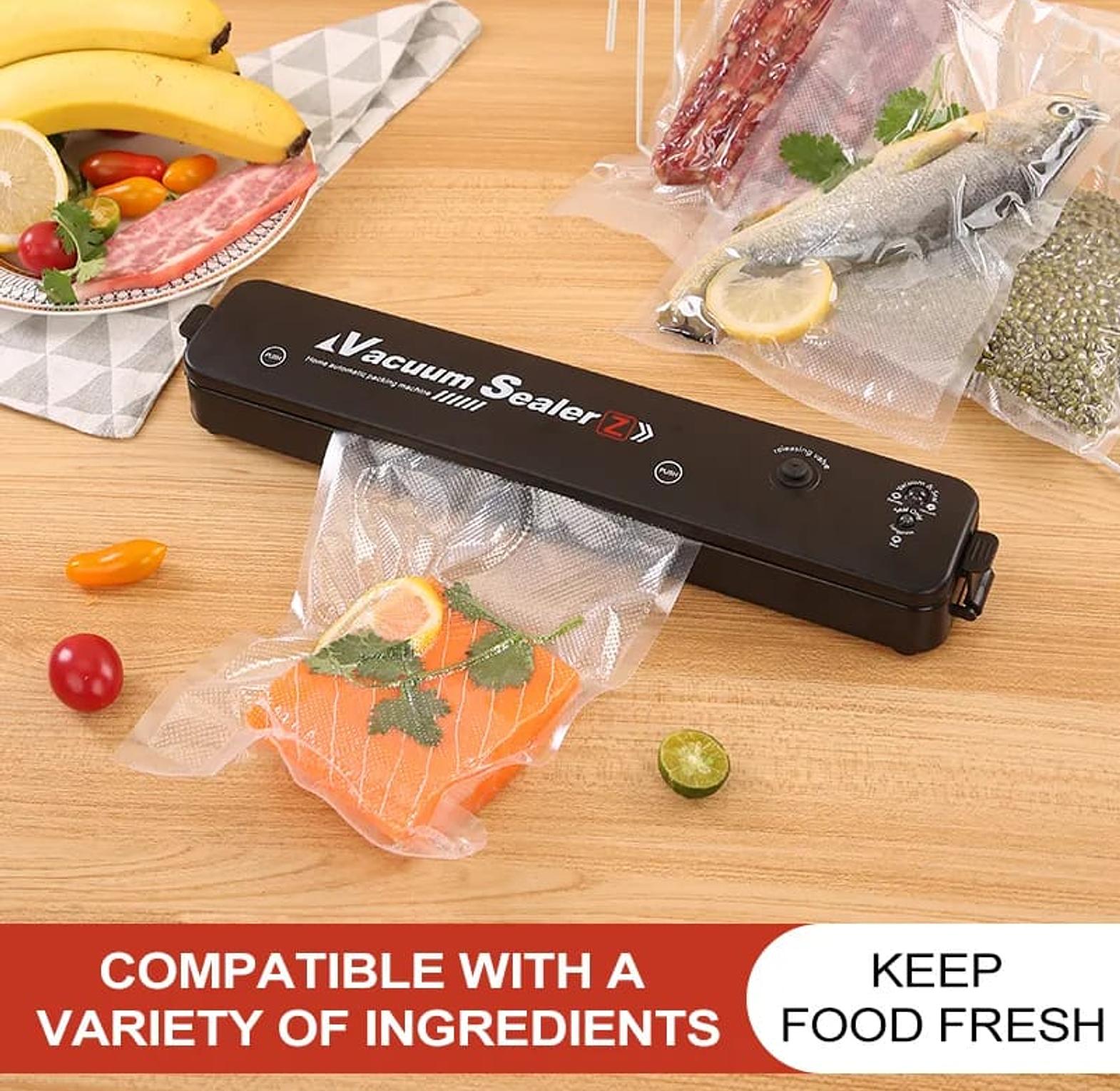 Vacuum thermal food sealer with 10 free vacuum bags. Keeps food fresh longer.