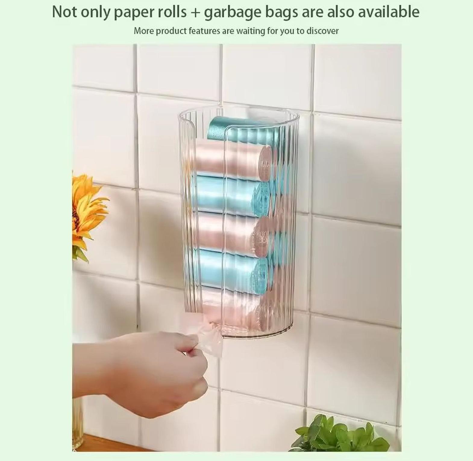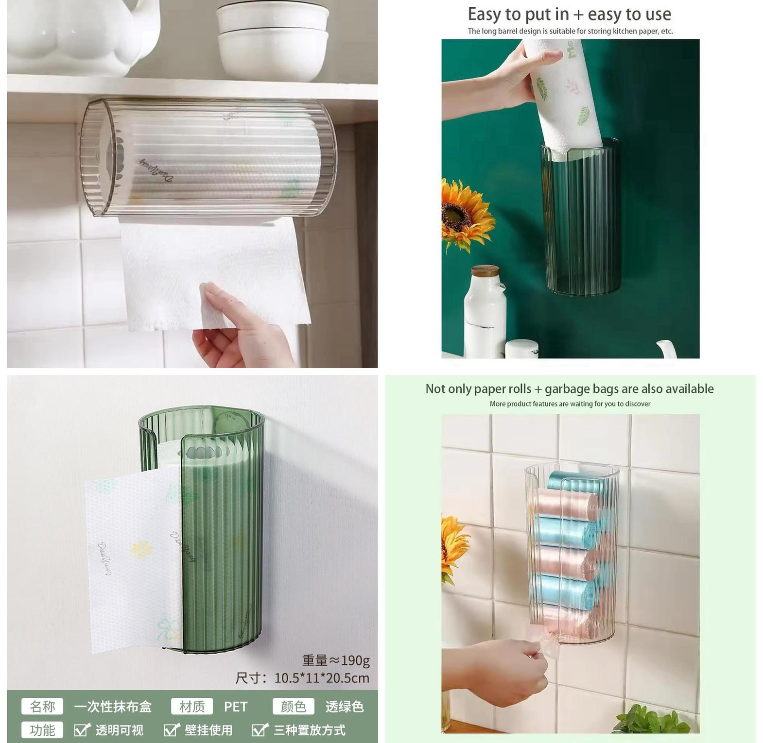 The wall-mounted transparent tissue box is a punch-free organizer designed to neatly store and protect toilet or kitchen paper while saving space.