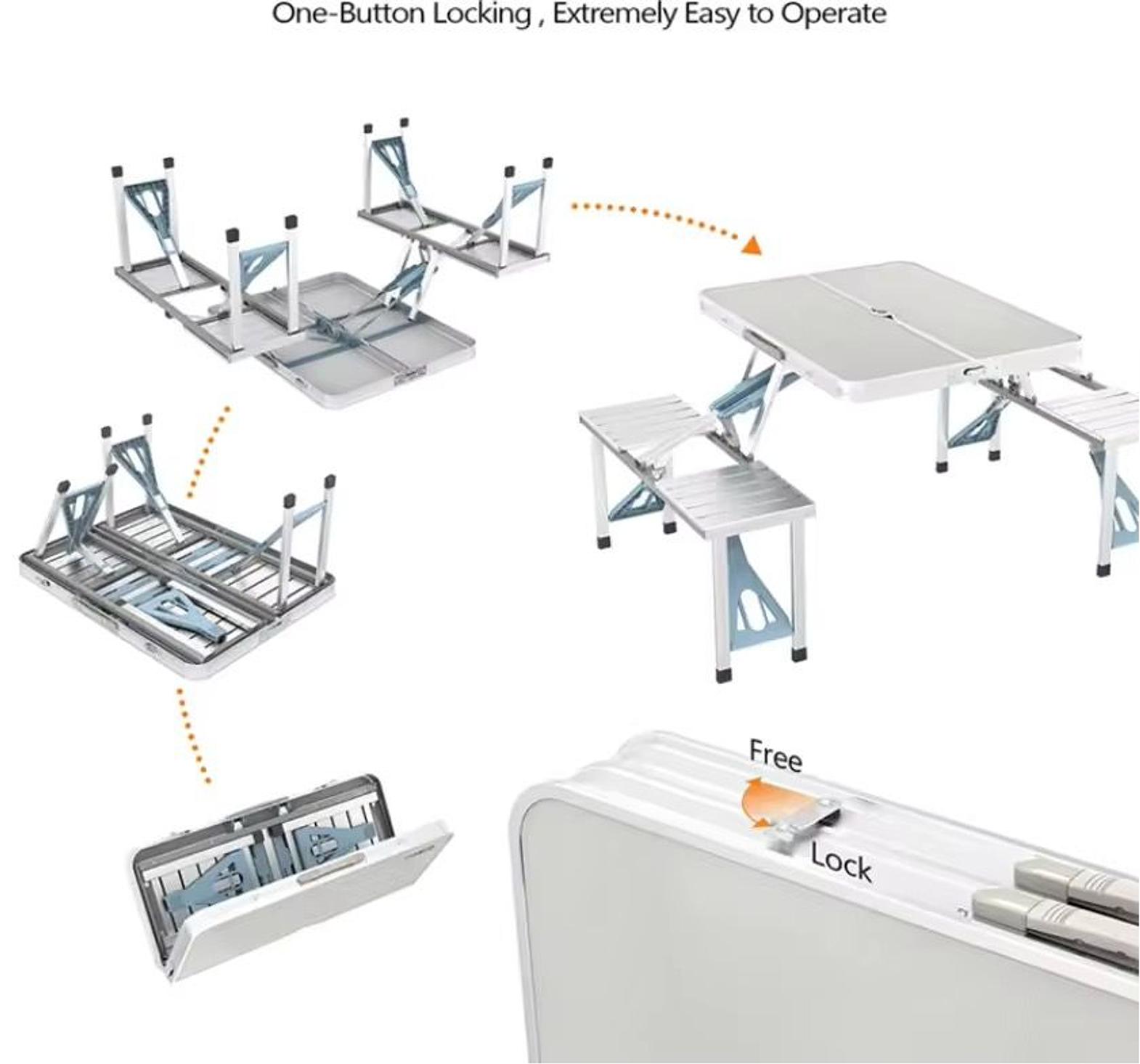 Folding adjustable aluminum alloy outdoor picnic and camping chair and table set with 4 seats.