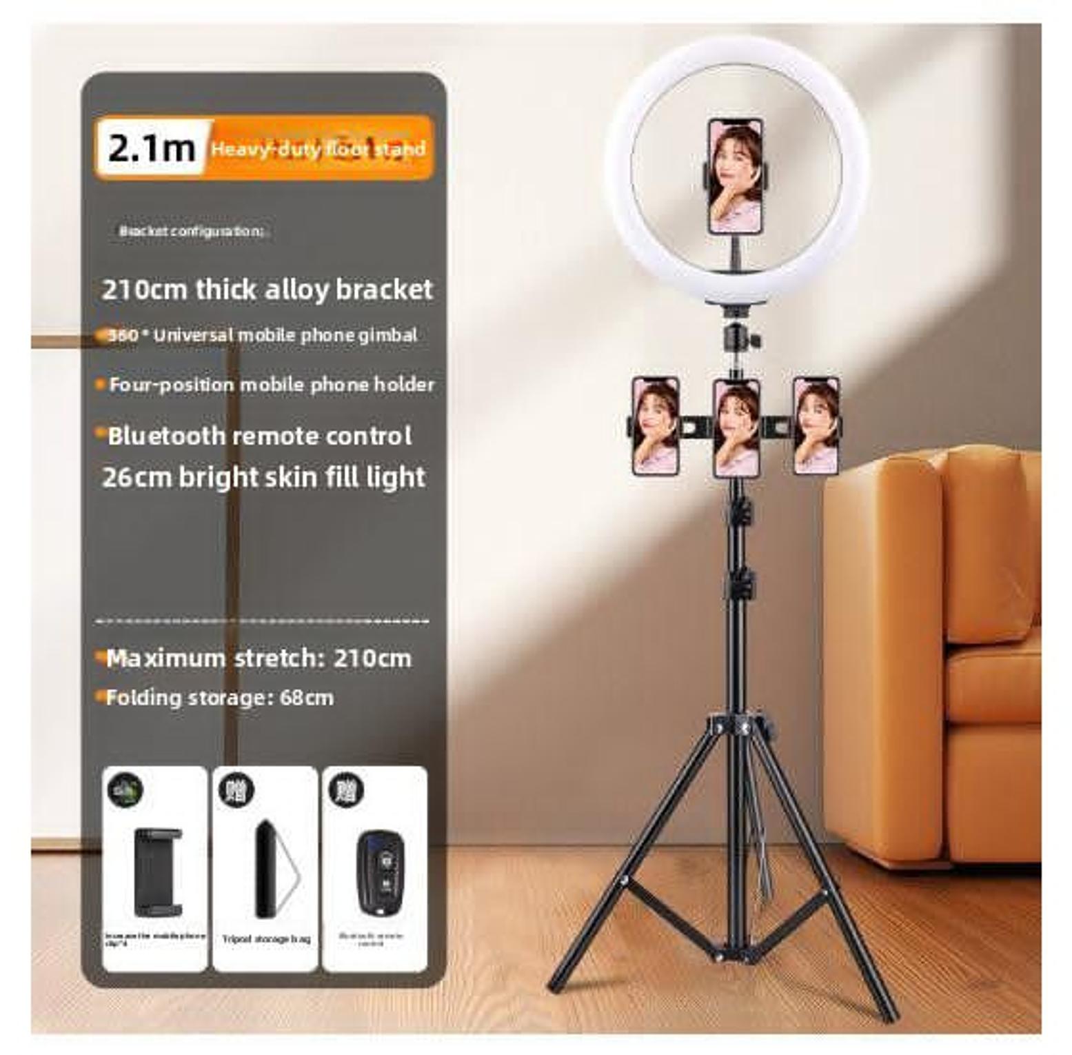 All-in-one professional lighting kit with a 210cm alloy stand, four camera mounts, 26cm beauty ring light, remote control, and storage bag—perfect for streaming, photography, and content creation.