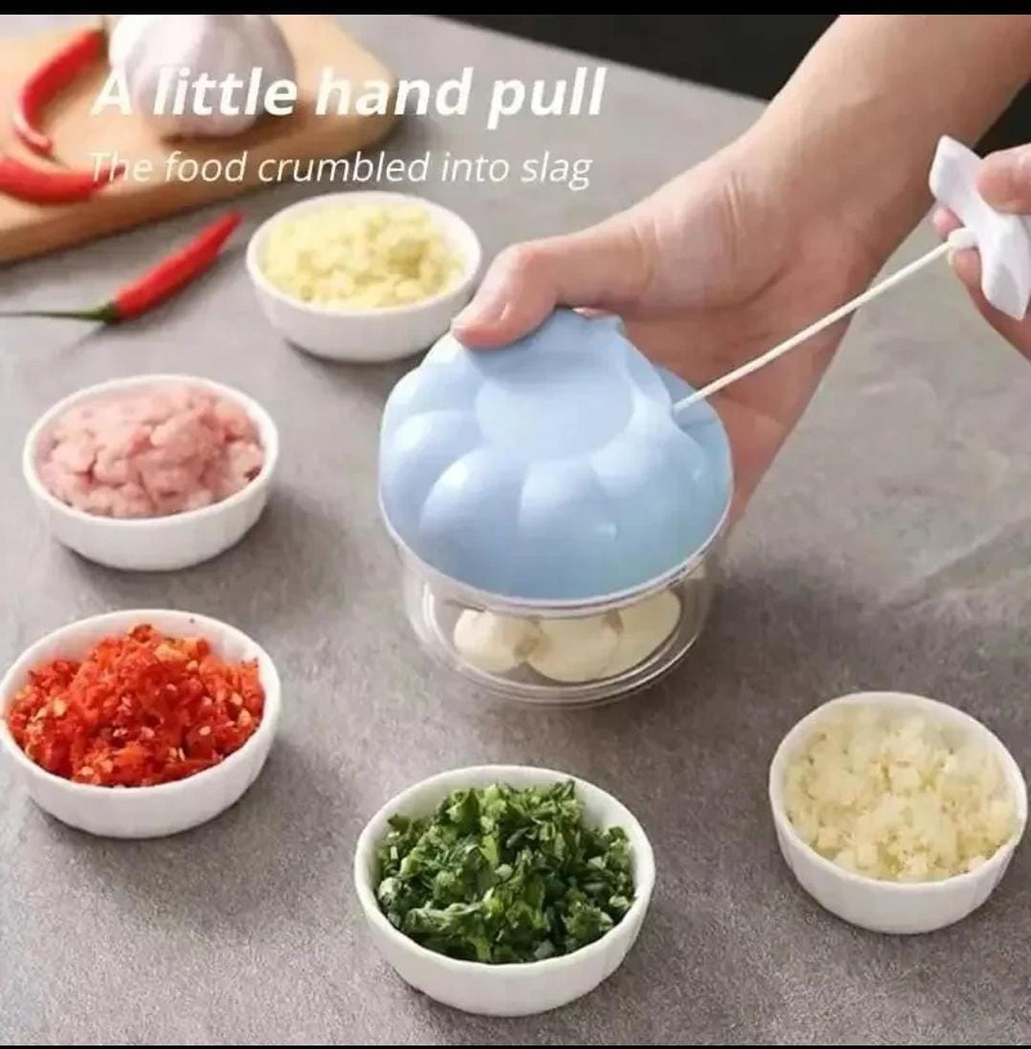 Manual multifunction kitchen chopper for quick chopping of garlic, onions, vegetables, and ginger.