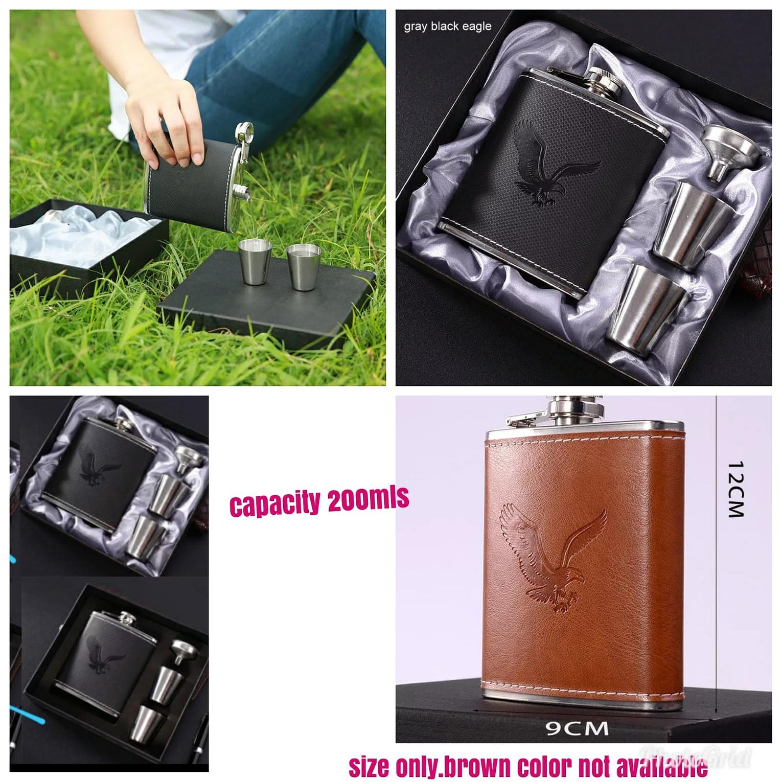 Stylish hip flask whisky bottle set that comes in a premium package with two matching tot cups.