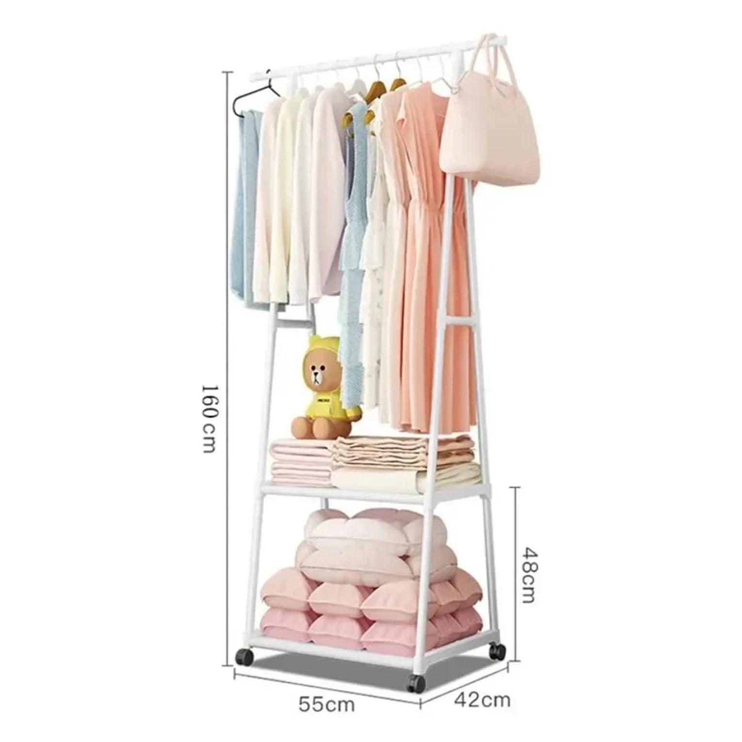 Indoor triangular mobile coat rack with wheels, multi-layer design for hanging and drying clothes.