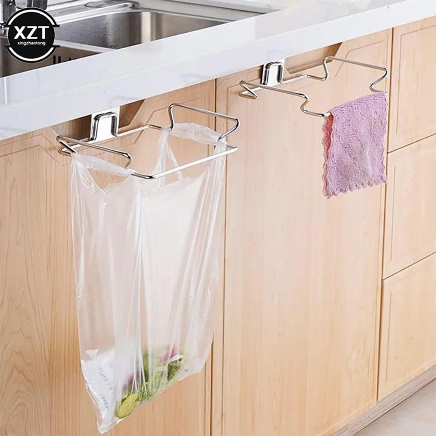 Metallic trash bag holder.