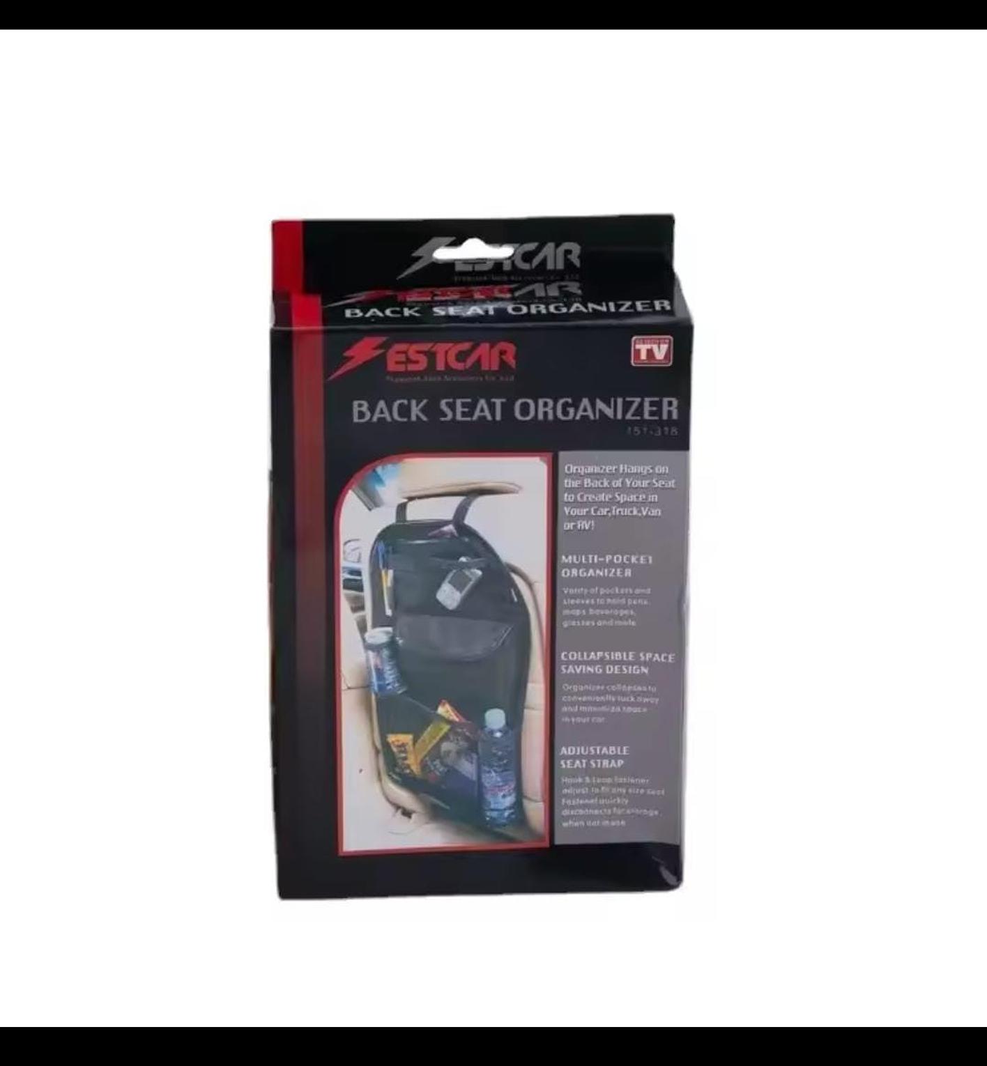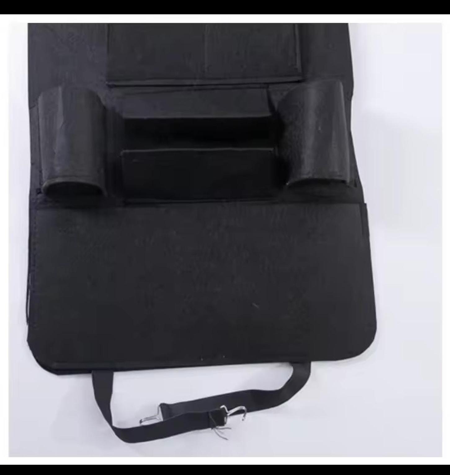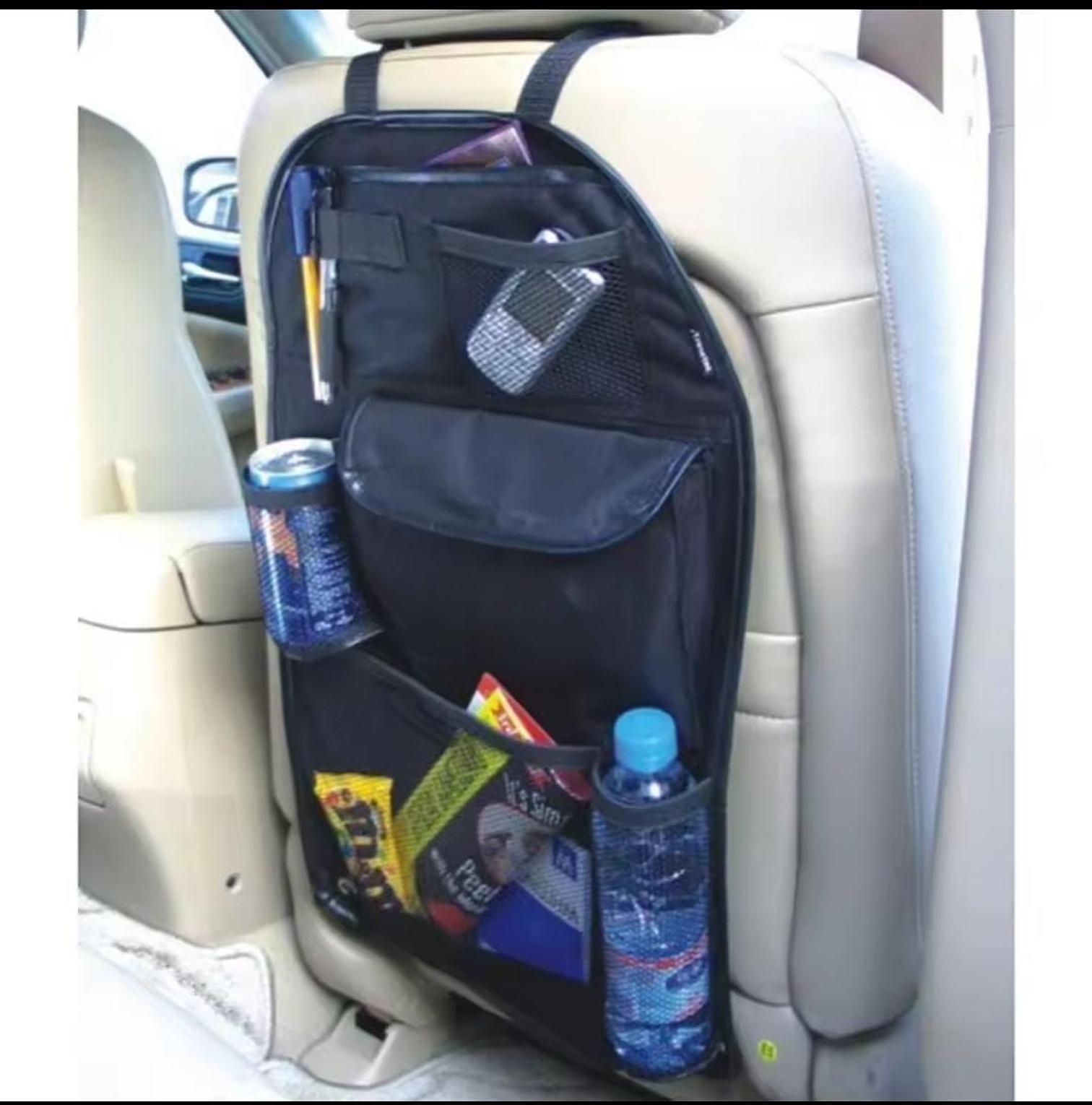 Multifunctional car seat storage bag and back organizer with space for iPad, water bottle, and other essentials.