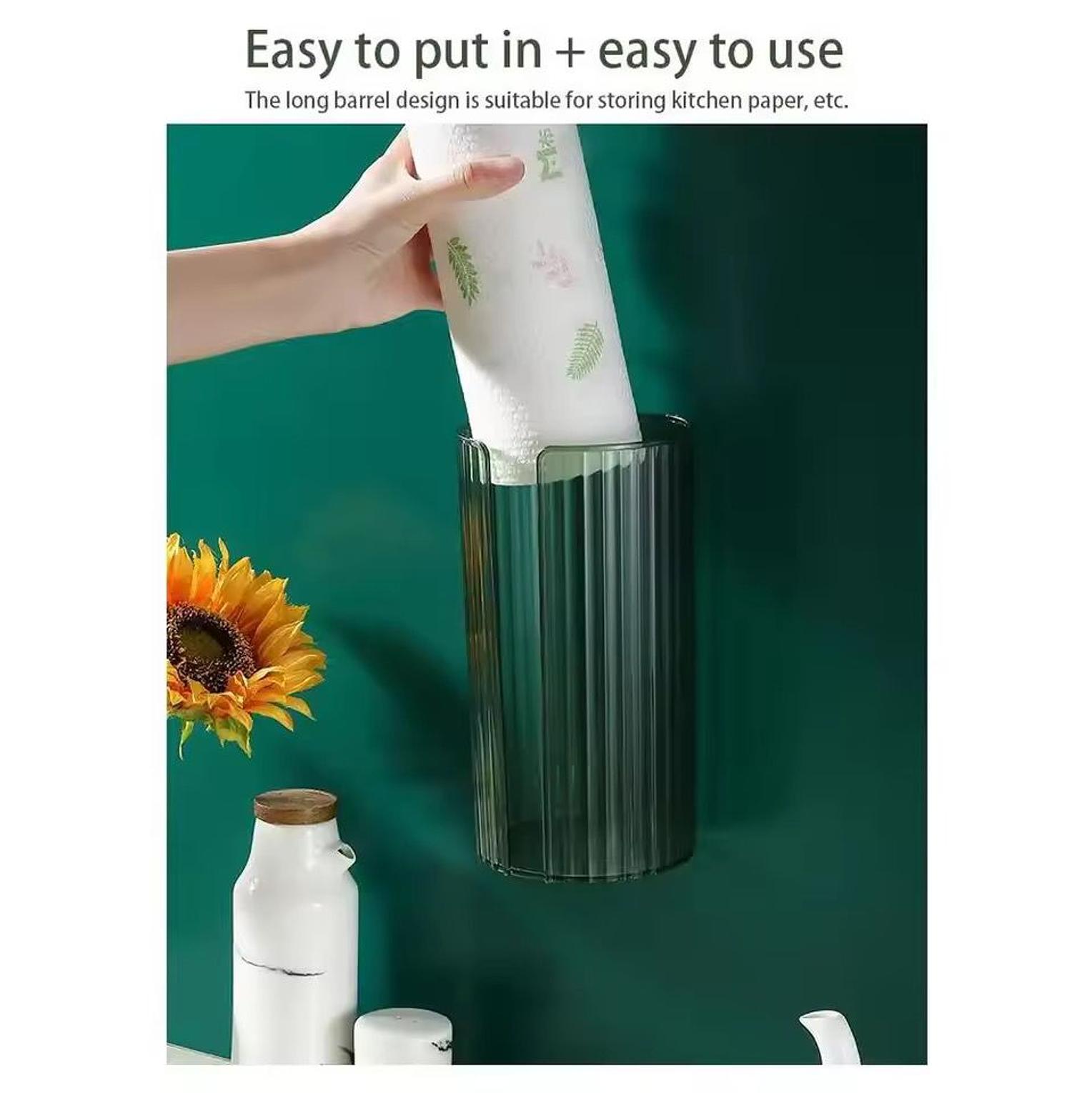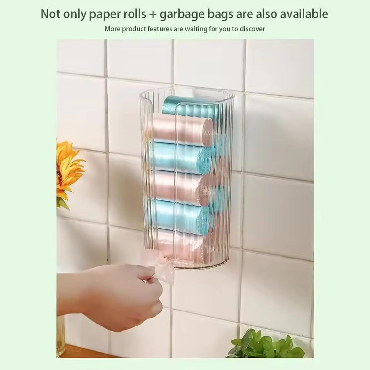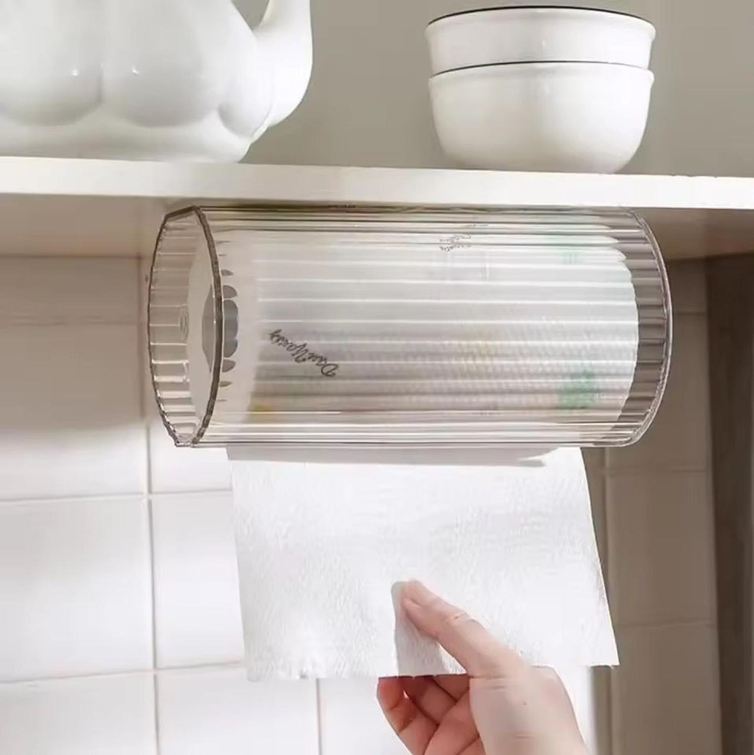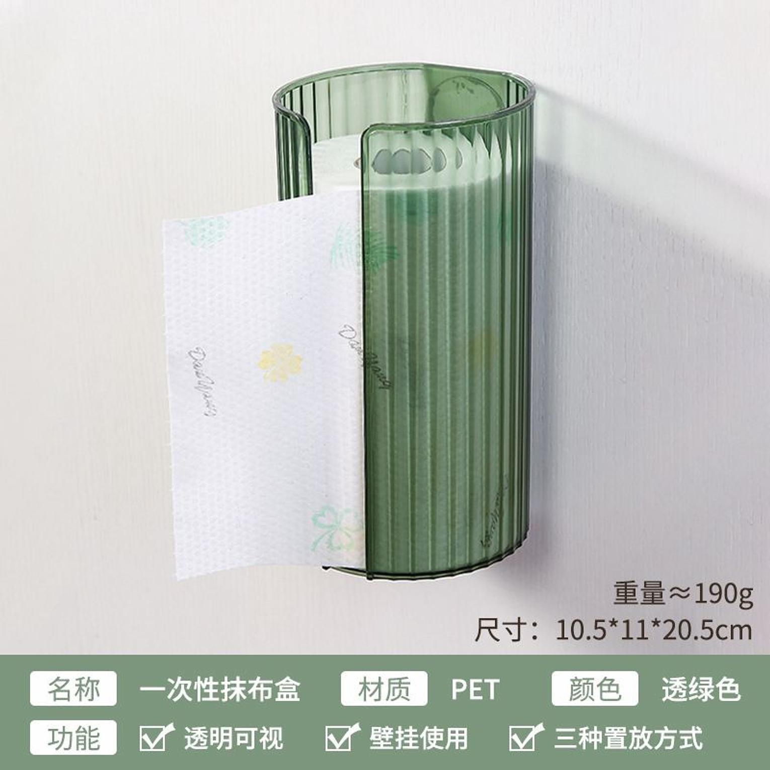 The wall-mounted transparent tissue box is a punch-free organizer designed to neatly store and protect toilet or kitchen paper while saving space.